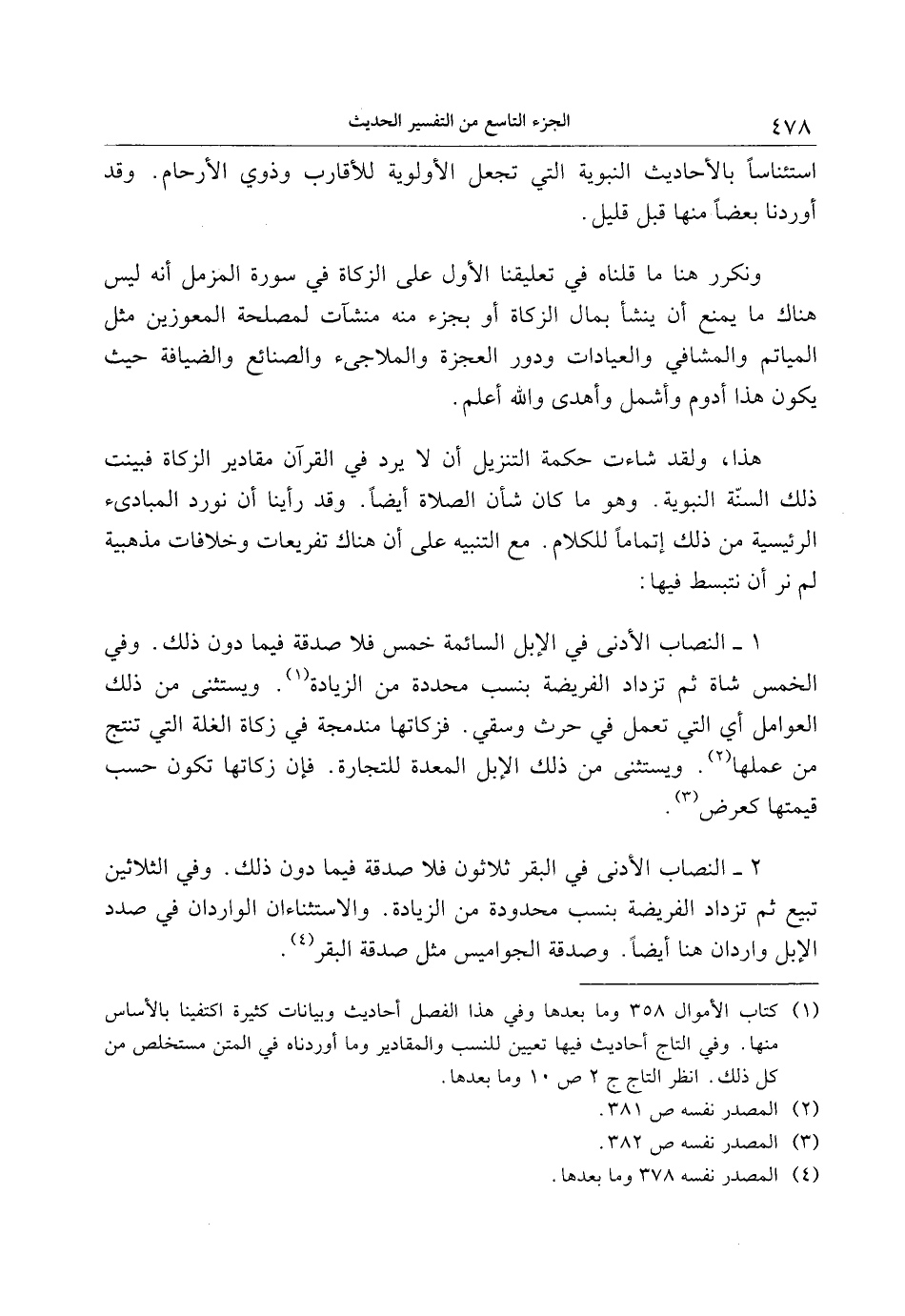 (1) كتاب الأموال 358 وما بعدها وفي هذا الفصل أحاديث وبيانات كثيرة اكتفينا بالأساس منها. وفي التاج أحاديث فيها تعيين للنسب والمقادير وما أوردناه في المتن مستخلص من كل ذلك. انظر التاج ج 2 ص 10 وما بعدها.