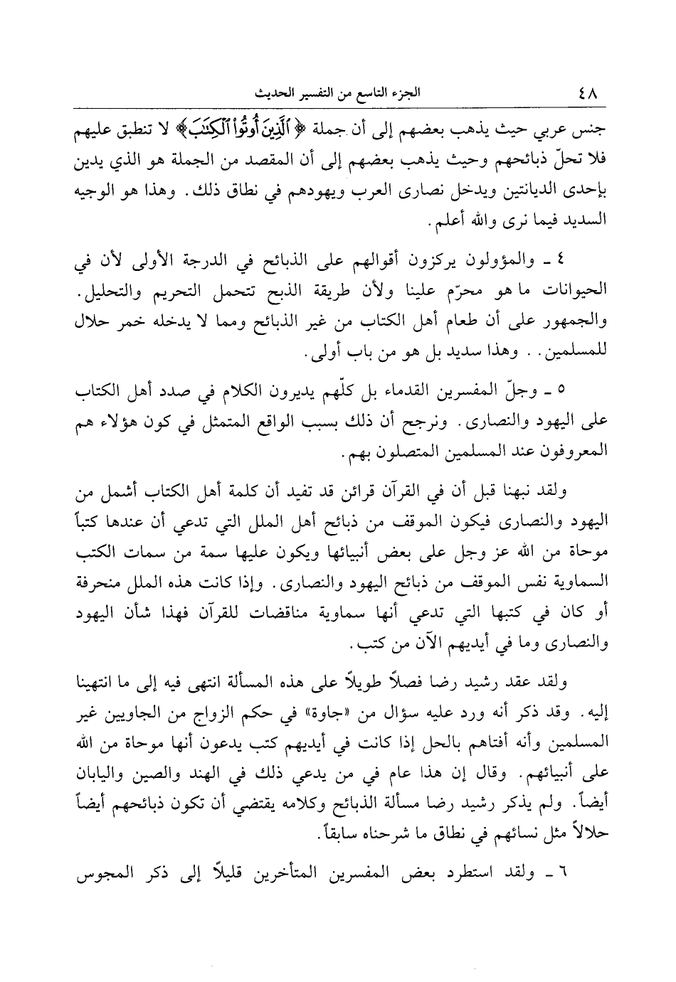ولقد عقد رشيد رضا فصلا طويلا على هذه المسألة انتهى فيه إلى ما انتهينا إليه. وقد ذكر أنه ورد عليه سؤال من «جاوة» في حكم الزواج من الجاويين غير المسلمين وأنه أفتاهم بالحل إذا كانت في أيديهم كتب يدعون أنها موحاة من الله على أنبيائهم. وقال إن هذا عام في من يدعي ذلك في الهند والصين واليابان أيضا. ولم يذكر رشيد رضا مسألة الذبائح وكلامه يقتضي أن تكون ذبائحهم أيضا حلالا مثل نسائهم في نطاق ما شرحناه سابقا.