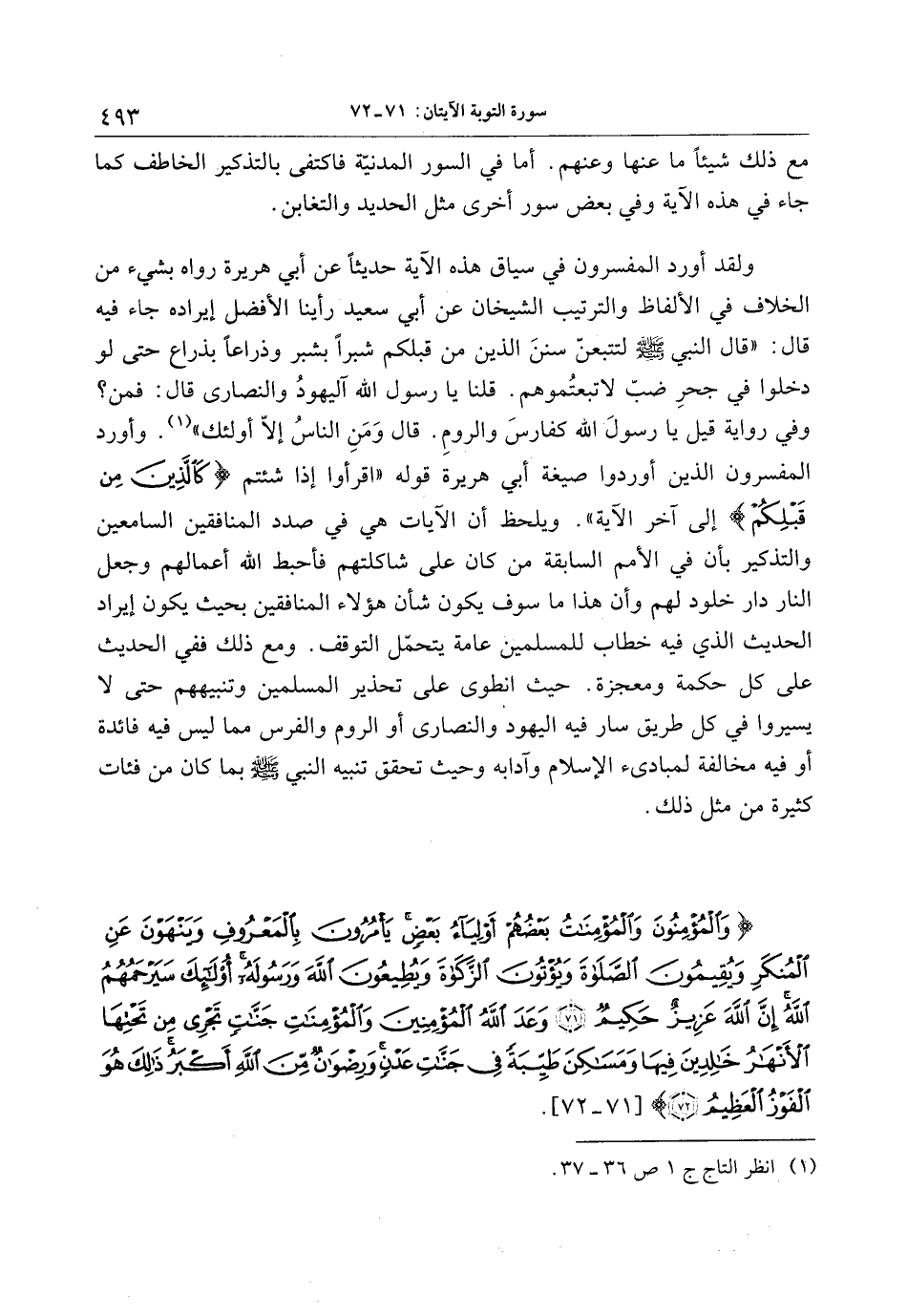 ولقد أورد المفسرون في سياق هذه الآية حديثا عن أبي هريرة رواه بشيء من الخلاف في الألفاظ والترتيب الشيخان عن أبي سعيد رأينا الأفضل إيراده جاء فيه قال: «قال النبي صلى الله عليه وسلم لتتبعنّ سنن الذين من قبلكم شبرا بشبر وذراعا بذراع حتى لو دخلوا في جحر ضبّ لا تبعتموهم. قلنا يا رسول الله اليهود والنصارى قال: فمن؟