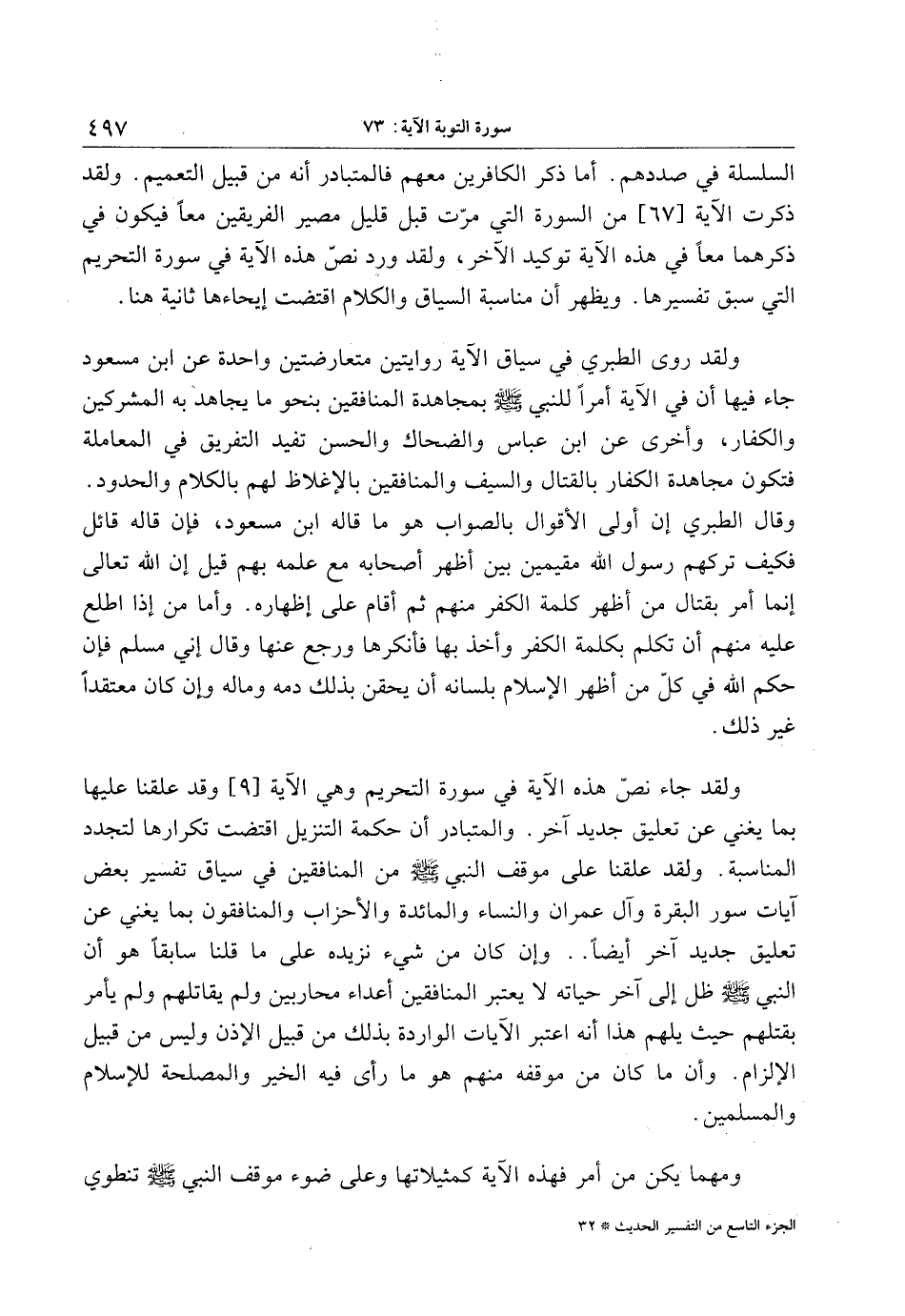ولقد جاء نصّ هذه الآية في سورة التحريم وهي الآية [9] وقد علقنا عليها بما يغني عن تعليق جديد آخر. والمتبادر أن حكمة التنزيل اقتضت تكرارها لتجدد المناسبة. ولقد علقنا على موقف النبي صلى الله عليه وسلم من المنافقين في سياق تفسير بعض آيات سور البقرة وآل عمران والنساء والمائدة والأحزاب والمنافقون بما يغني عن تعليق جديد آخر أيضا.. وإن كان من شيء نزيده على ما قلنا سابقا هو أن النبي صلى الله عليه وسلم ظل إلى آخر حياته لا يعتبر المنافقين أعداء محاربين ولم يقاتلهم ولم يأمر بقتلهم حيث يلهم هذا أنه اعتبر الآيات الواردة بذلك من قبيل الإذن وليس من قبيل الإلزام. وأن ما كان من موقفه منهم هو ما رأى فيه الخير والمصلحة للإسلام والمسلمين.