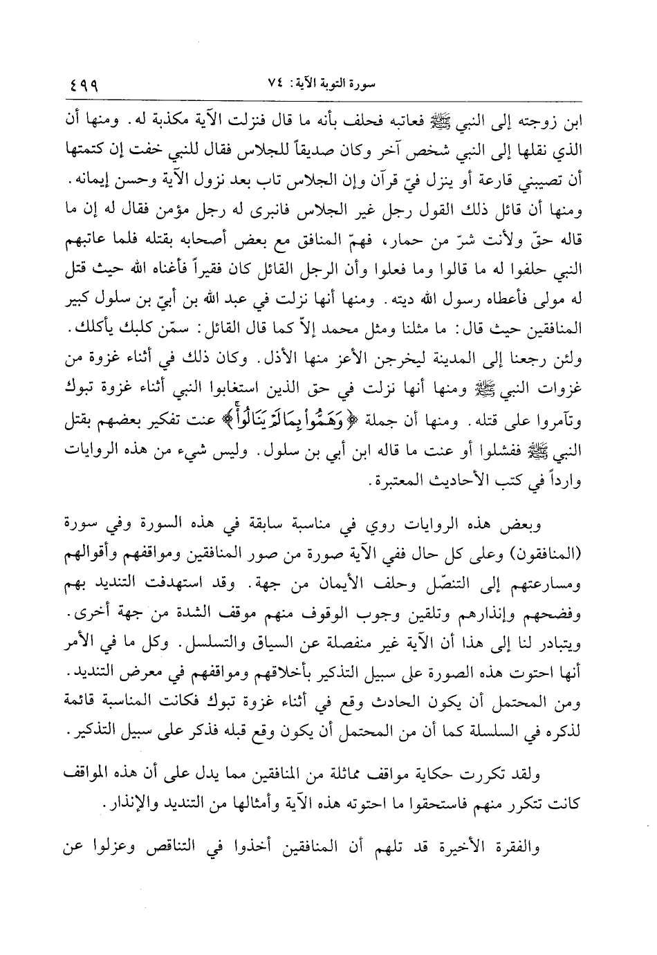 ولئن رجعنا إلى المدينة ليخرجن الأعز منها الأذل. وكان ذلك في أثناء غزوة من غزوات النبي صلى الله عليه وسلم ومنها أنها نزلت في حق الذين استغابوا النبي أثناء غزوة تبوك وتآمروا على قتله. ومنها أن جملة وَهَمُّوا بِما لَمْ يَنالُوا عنت تفكير بعضهم بقتل النبي صلى الله عليه وسلم ففشلوا أو عنت ما قاله ابن أبي بن سلول. وليس شيء من هذه الروايات واردا في كتب الأحاديث المعتبرة.