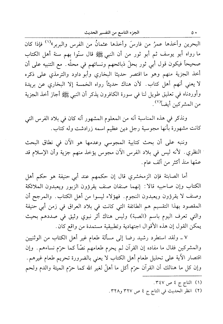 البحرين وأخذها عمر من فارس وأخذها عثمان من الفرس والبربر» «1» فإذا كان ما رواه أبو يوسف ثم أبو ثور من أن النبي صلى الله عليه وسلم قال سنّوا بهم سنة أهل الكتاب صحيحا فيكون قول أبي ثور بحلّ ذبائحهم ونسائهم في محلّه. مع التنبيه على أن أخذ الجزية منهم وهو ما اقتصر حديثا البخاري وأبو داود والترمذي على ذكره لا يعني أنهم أهل كتاب. لأن هناك حديثا رواه الخمسة إلا البخاري عن بريدة وأوردناه في تعليق طويل لنا في سورة الكافرون يذكر أن النبي صلى الله عليه وسلم أجاز أخذ الجزية من المشركين أيضا «2» .