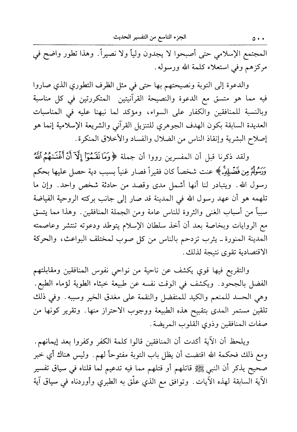 ولقد ذكرنا قبل أن المفسرين رووا أن جملة وَما نَقَمُوا إِلَّا أَنْ أَغْناهُمُ اللَّهُ وَرَسُولُهُ مِنْ فَضْلِهِ عنت شخصا كان فقيرا فصار غنيا بسبب دية حصل عليها بحكم رسول الله. ويتبادر لنا أنها أشمل مدى وقصد من حادثة شخص واحد. وإن ما تلهمه هو أن عهد رسول الله في المدينة قد صار إلى جانب بركته الروحية الفياضة سببا من أسباب الغنى والثروة للناس عامة ومن الجملة المنافقين. وهذا مما يتسق مع الروايات وبخاصة بعد أن أخذ سلطان الإسلام يتوطد ودعوته تنتشر وعاصمته المدينة المنورة- يثرب تزدحم بالناس من كل صوب لمختلف البواعث، والحركة الاقتصادية تقوى نتيجة لذلك.