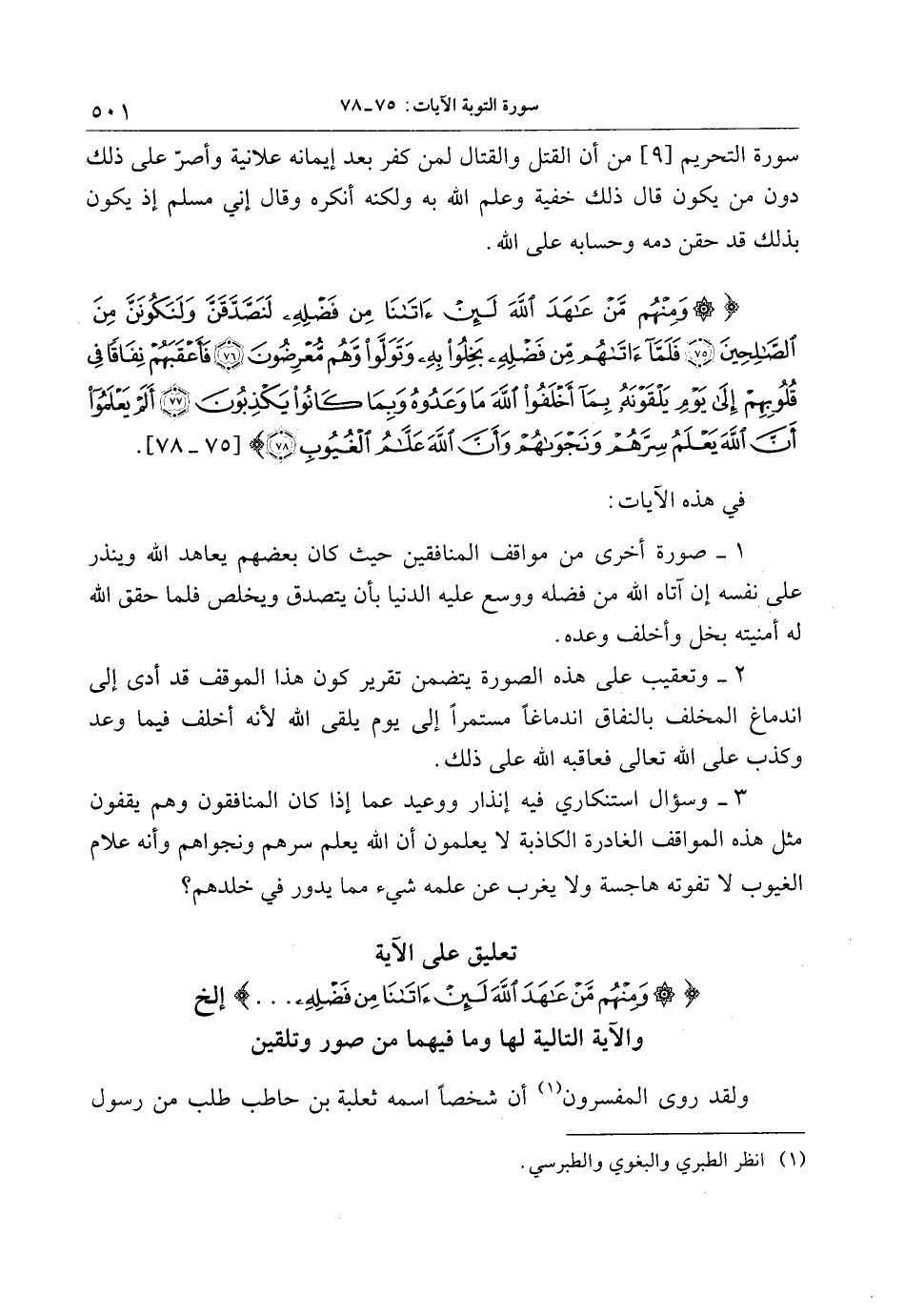 وَمِنْهُمْ مَنْ عاهَدَ اللَّهَ لَئِنْ آتانا مِنْ فَضْلِهِ لَنَصَّدَّقَنَّ وَلَنَكُونَنَّ مِنَ الصَّالِحِينَ (75) فَلَمَّا آتاهُمْ مِنْ فَضْلِهِ بَخِلُوا بِهِ وَتَوَلَّوْا وَهُمْ مُعْرِضُونَ (76) فَأَعْقَبَهُمْ نِفاقاً فِي قُلُوبِهِمْ إِلى يَوْمِ يَلْقَوْنَهُ بِما أَخْلَفُوا اللَّهَ ما وَعَدُوهُ وَبِما كانُوا يَكْذِبُونَ (77) أَلَمْ يَعْلَمُوا أَنَّ اللَّهَ يَعْلَمُ سِرَّهُمْ وَنَجْواهُمْ وَأَنَّ اللَّهَ عَلاَّمُ الْغُيُوبِ (78)