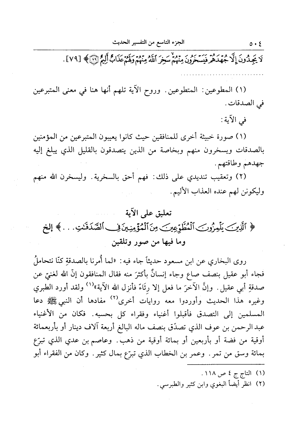 تعليق على الآية الَّذِينَ يَلْمِزُونَ الْمُطَّوِّعِينَ مِنَ الْمُؤْمِنِينَ فِي الصَّدَقاتِ ... إلخ وما فيها من صور وتلقين