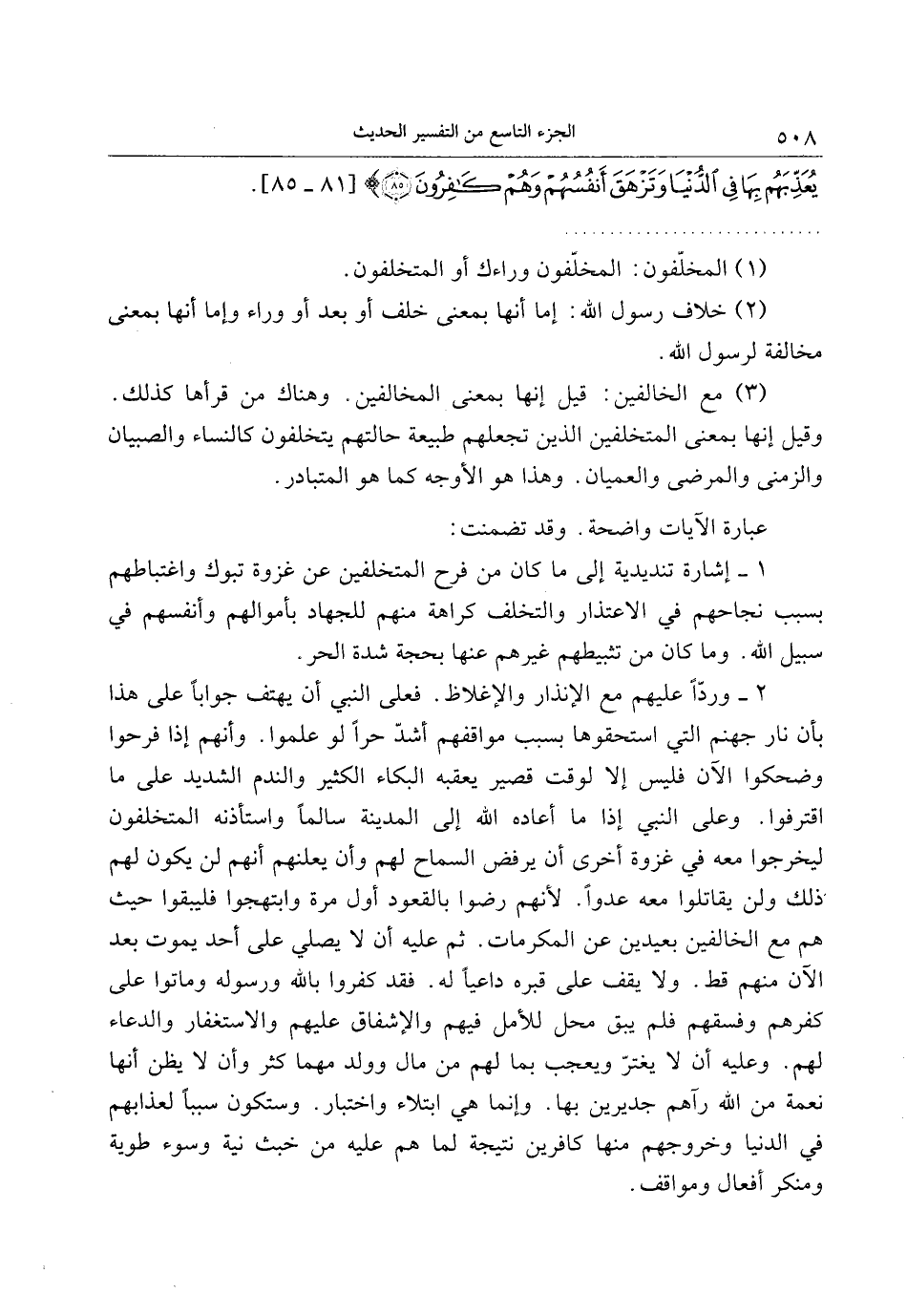 2- وردّا عليهم مع الإنذار والإغلاظ. فعلى النبي أن يهتف جوابا على هذا بأن نار جهنم التي استحقوها بسبب مواقفهم أشدّ حرا لو علموا. وأنهم إذا فرحوا وضحكوا الآن فليس إلا لوقت قصير يعقبه البكاء الكثير والندم الشديد على ما اقترفوا. وعلى النبي إذا ما أعاده الله إلى المدينة سالما واستأذنه المتخلفون ليخرجوا معه في غزوة أخرى أن يرفض السماح لهم وأن يلعنهم أنهم لن يكون لهم ذلك ولن يقاتلوا معه عدوا. لأنهم رضوا بالقعود أول مرة وابتهجوا فليبقوا حيث هم مع الخالفين بعيدين عن المكرمات. ثم عليه أن لا يصلي على أحد يموت بعد الآن منهم قط. ولا يقف على قبره داعيا له. فقد كفروا بالله ورسوله وماتوا على كفرهم وفسقهم فلم يبق محل للأمل فيهم والإشفاق عليهم والاستغفار والدعاء لهم. وعليه أن لا يغترّ ويعجب بما لهم من مال وولد مهما كثر وأن لا يظن أنها نعمة من الله رآهم جديرين بها. وإنما هي ابتلاء واختبار. وستكون سببا لعذابهم في الدنيا وخروجهم منها كافرين نتيجة لما هم عليه من خبث نية وسوء طوية ومنكر أفعال ومواقف.