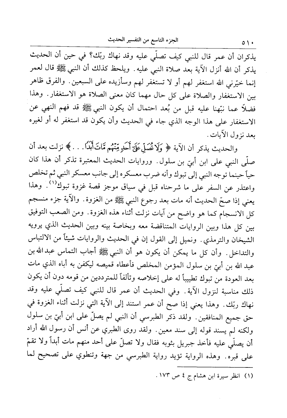 والحديث يذكر أن الآية وَلا تُصَلِّ عَلى أَحَدٍ مِنْهُمْ ماتَ أَبَداً ... نزلت بعد أن صلّى النبي على ابن أبيّ بن سلول. وروايات الحديث المعتبرة تذكر أن هذا كان حيا حينما توجه النبي إلى تبوك وأنه ضرب معسكره إلى جانب معسكر النبي ثم تخلص واعتذر عن السفر على ما شرحناه قبل في سياق موجز قصة غزوة تبوك «1» . وهذا يعني إذا صحّ الحديث أنه مات بعد رجوع النبي صلى الله عليه وسلم من الغزوة. والآية جزء منسجم كل الانسجام كما هو واضح من آيات نزلت أثناء هذه الغزوة. ومن الصعب التوفيق بين كل هذا وبين الروايات المتناقضة معه وبخاصة بينه وبين الحديث الذي يرويه الشيخان والترمذي. ونميل إلى القول إن في الحديث والروايات شيئا من الالتباس والتداخل. وأن كل ما يمكن أن يكون هو أن النبي صلى الله عليه وسلم أجاب التماس عبد الله بن عبد الله بن أبيّ بن سلول المؤمن المخلص فأعطاه قميصه ليكفن به أباه الذي مات بعد العودة من تبوك تطييبا له على إخلاصه وتألفا للمترددين من قومه دون أن يكون ذلك مناسبة لنزول الآية. وفي الحديث أن عمر قال للنبي كيف تصلّي عليه وقد نهاك ربّك. وهذا يعني إذا صح أن عمر استند إلى الآية التي نزلت أثناء الغزوة في حق جميع المنافقين. ولقد ذكر الطبرسي أن النبي لم يصلّ على ابن أبيّ بن سلول ولكنه لم يسند قوله إلى سند معين. ولقد روى الطبري عن أنس أن رسول الله أراد أن يصلّي عليه فأخذ جبريل بثوبه فقال ولا تصلّ على أحد منهم مات أبدا ولا تقم على قبره. وهذه الرواية تؤيد رواية الطبرسي من جهة وتنطوي على تصحيح لما