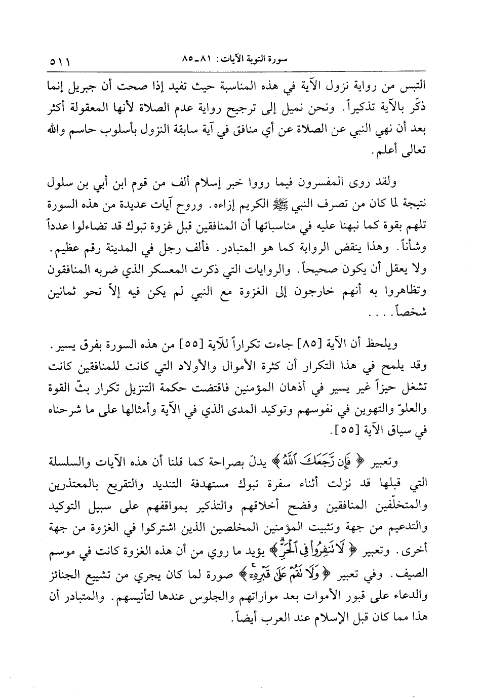 وتعبير فَإِنْ رَجَعَكَ اللَّهُ يدلّ بصراحة كما قلنا أن هذه الآيات والسلسلة التي قبلها قد نزلت أثناء سفرة تبوك مستهدفة التنديد والتقريع بالمعتذرين والمتخلّفين المنافقين وفضح أخلاقهم والتذكير بمواقفهم على سبيل التوكيد والتدعيم من جهة وتثبيت المؤمنين المخلصين الذين اشتركوا في الغزوة من جهة أخرى. وتعبير لا تَنْفِرُوا فِي الْحَرِّ يؤيد ما روي من أن هذه الغزوة كانت في موسم الصيف. وفي تعبير وَلا تَقُمْ عَلى قَبْرِهِ صورة لما كان يجري من تشييع الجنائز والدعاء على قبور الأموات بعد مواراتهم والجلوس عندها لتأنيسهم. والمتبادر أن هذا مما كان قبل الإسلام عند العرب أيضا.