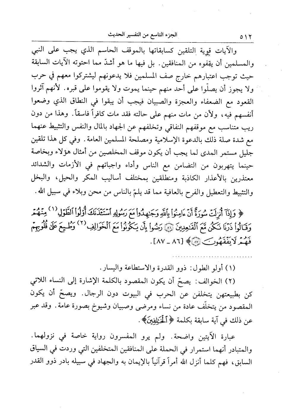 وَإِذا أُنْزِلَتْ سُورَةٌ أَنْ آمِنُوا بِاللَّهِ وَجاهِدُوا مَعَ رَسُولِهِ اسْتَأْذَنَكَ أُولُوا الطَّوْلِ مِنْهُمْ وَقالُوا ذَرْنا نَكُنْ مَعَ الْقاعِدِينَ (86) رَضُوا بِأَنْ يَكُونُوا مَعَ الْخَوالِفِ وَطُبِعَ عَلى قُلُوبِهِمْ فَهُمْ لا يَفْقَهُونَ (87)