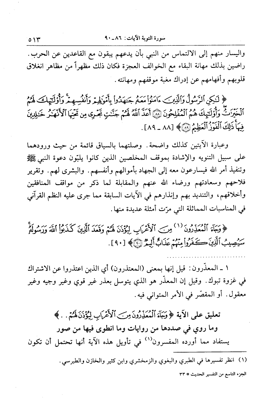 تعليق على الآية وَجاءَ الْمُعَذِّرُونَ مِنَ الْأَعْرابِ لِيُؤْذَنَ لَهُمْ.. وما روي في صددها من روايات وما انطوى فيها من صور