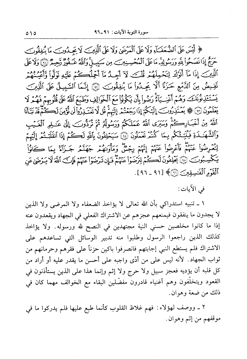 لَيْسَ عَلَى الضُّعَفاءِ وَلا عَلَى الْمَرْضى وَلا عَلَى الَّذِينَ لا يَجِدُونَ ما يُنْفِقُونَ حَرَجٌ إِذا نَصَحُوا لِلَّهِ وَرَسُولِهِ ما عَلَى الْمُحْسِنِينَ مِنْ سَبِيلٍ وَاللَّهُ غَفُورٌ رَحِيمٌ (91) وَلا عَلَى الَّذِينَ إِذا ما أَتَوْكَ لِتَحْمِلَهُمْ قُلْتَ لا أَجِدُ ما أَحْمِلُكُمْ عَلَيْهِ تَوَلَّوْا وَأَعْيُنُهُمْ تَفِيضُ مِنَ الدَّمْعِ حَزَناً أَلاَّ يَجِدُوا ما يُنْفِقُونَ (92) إِنَّمَا السَّبِيلُ عَلَى الَّذِينَ يَسْتَأْذِنُونَكَ وَهُمْ أَغْنِياءُ رَضُوا بِأَنْ يَكُونُوا مَعَ الْخَوالِفِ وَطَبَعَ اللَّهُ عَلى قُلُوبِهِمْ فَهُمْ لا يَعْلَمُونَ (93) يَعْتَذِرُونَ إِلَيْكُمْ إِذا رَجَعْتُمْ إِلَيْهِمْ قُلْ لا تَعْتَذِرُوا لَنْ نُؤْمِنَ لَكُمْ قَدْ نَبَّأَنَا اللَّهُ مِنْ أَخْبارِكُمْ وَسَيَرَى اللَّهُ عَمَلَكُمْ وَرَسُولُهُ ثُمَّ تُرَدُّونَ إِلى عالِمِ الْغَيْبِ وَالشَّهادَةِ فَيُنَبِّئُكُمْ بِما كُنْتُمْ تَعْمَلُونَ (94) سَيَحْلِفُونَ بِاللَّهِ لَكُمْ إِذَا انْقَلَبْتُمْ إِلَيْهِمْ لِتُعْرِضُوا عَنْهُمْ فَأَعْرِضُوا عَنْهُمْ إِنَّهُمْ رِجْسٌ وَمَأْواهُمْ جَهَنَّمُ جَزاءً بِما كانُوا يَكْسِبُونَ (95)