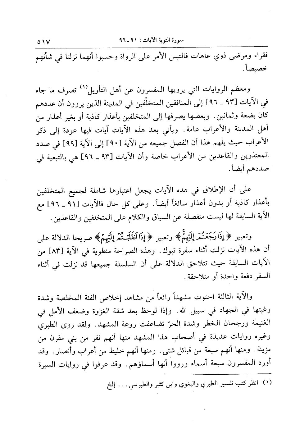ومعظم الروايات التي يرويها المفسرون عن أهل التأويل «1» تصرف ما جاء في الآيات [93- 96] إلى المنافقين المتخلّفين في المدينة الذين يروون أن عددهم كان بضعة وثمانين. وبعضها يصرفها إلى المتخلفين بأعذار كاذبة أو بغير أعذار من أهل المدينة والأعراب عامة. ويأتي بعد هذه الآيات آيات فيها عودة إلى ذكر الأعراب حيث يلهم هذا أن الفصل جميعه من الآية [90] إلى الآية [99] في صدد المعتذرين والقاعدين من الأعراب خاصة وأن الآيات [93- 96] هي بالتبعية في صددهم أيضا.