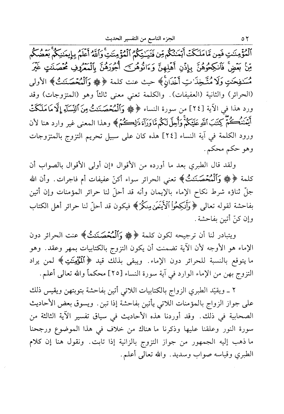 ولقد قال الطبري بعد ما أورده من الأقوال «إن أولى الأقوال بالصواب أن كلمة وَالْمُحْصَناتُ تعني الحرائر سواء أكنّ عفيفات أم فاجرات. وأن الله جلّ ثناؤه شرط نكاح الإماء بالإيمان وأنه قد أحلّ لنا حرائر المؤمنات وإن أتين بفاحشة لقوله تعالى وَأَنْكِحُوا الْأَيامى مِنْكُمْ فيكون قد أحلّ لنا حرائر أهل الكتاب وإن كنّ أتين بفاحشة.