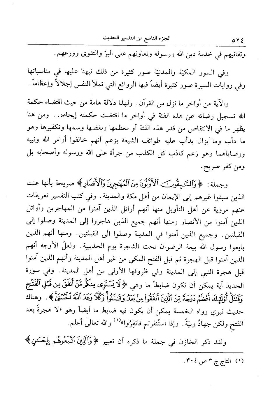وجملة: وَالسَّابِقُونَ الْأَوَّلُونَ مِنَ الْمُهاجِرِينَ وَالْأَنْصارِ صريحة بأنها عنت الذين سبقوا غيرهم إلى الإيمان من أهل مكة والمدينة. وفي كتب التفسير تعريفات عنهم مروية عن أهل التأويل منها أنهم أوائل الذين آمنوا من المهاجرين وأوائل الذين آمنوا من الأنصار ومنها أنهم جميع الذين هاجروا إلى المدينة وصلوا إلى القبلتين. وجميع الذين آمنوا في المدينة وصلوا إلى القبلتين. ومنها أنهم الذين بايعوا رسول الله بيعة الرضوان تحت الشجرة يوم الحديبية. ولعلّ الأوجه أنهم الذين آمنوا قبل الهجرة ثم قبل الفتح المكي من غير أهل المدينة وأنهم الذين آمنوا قبل هجرة النبي إلى المدينة وفي ظروفها الأولى من أهل المدينة. وفي سورة الحديد آية يمكن أن تكون ضابطا ما وهي لا يَسْتَوِي مِنْكُمْ مَنْ أَنْفَقَ مِنْ قَبْلِ الْفَتْحِ وَقاتَلَ أُولئِكَ أَعْظَمُ دَرَجَةً مِنَ الَّذِينَ أَنْفَقُوا مِنْ بَعْدُ وَقاتَلُوا وَكُلًّا وَعَدَ اللَّهُ الْحُسْنى. وهناك حديث نبوي رواه الخمسة يمكن أن يكون فيه ضابط ما أيضا وهو «لا هجرة بعد الفتح ولكن جهاد ونيّة. وإذا استنفرتم فانفروا» «1» والله تعالى أعلم.