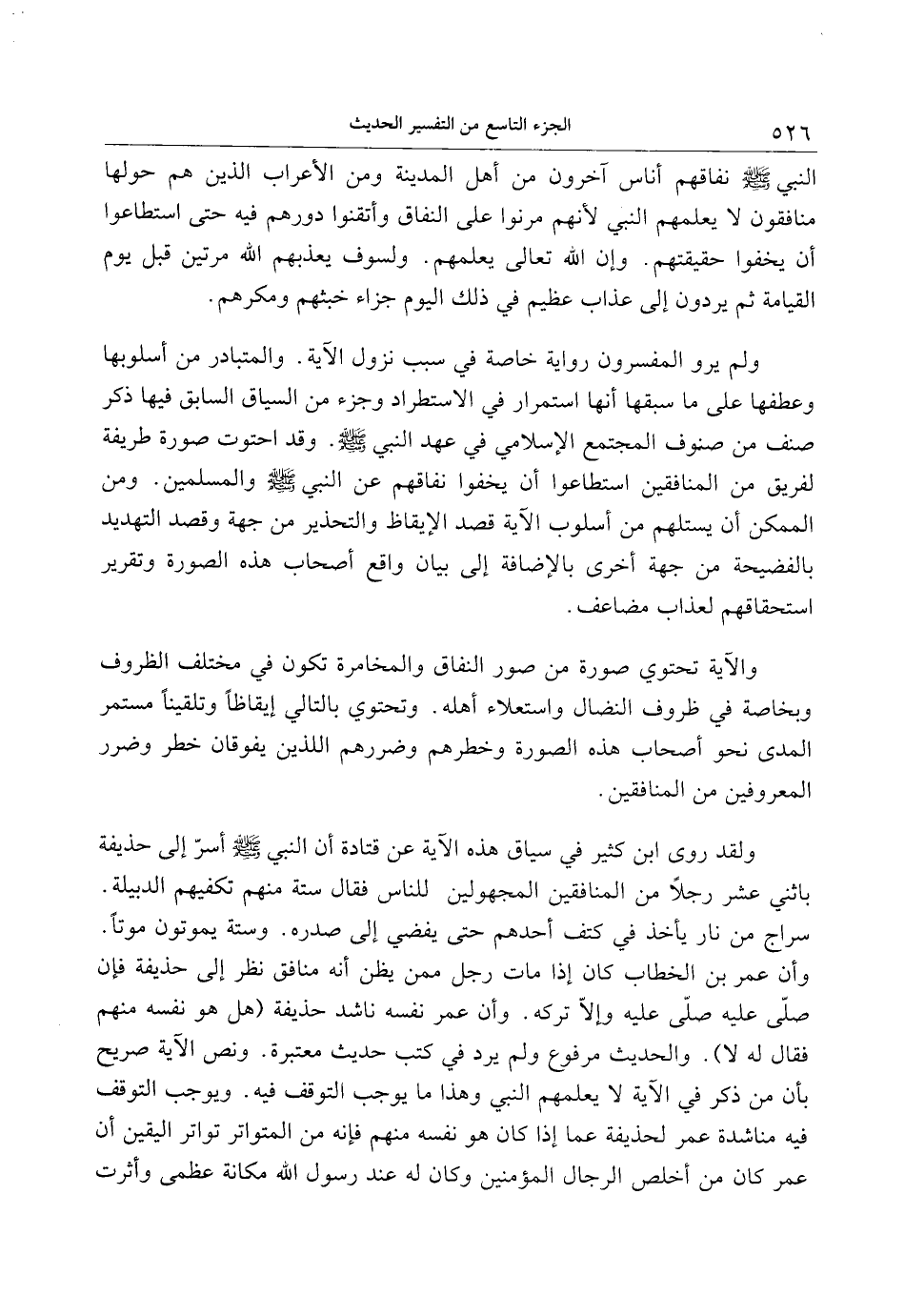 وأن عمر بن الخطاب كان إذا مات رجل ممن يظن أنه منافق نظر إلى حذيفة فإن صلّى عليه صلّى عليه وإلّا تركه. وأن عمر نفسه ناشد حذيفة (هل هو نفسه منهم فقال له لا) . والحديث مرفوع ولم يرد في كتب حديث معتبرة. ونص الآية صريح بأن من ذكر في الآية لا يعلمهم النبي وهذا ما يوجب التوقف فيه. ويوجب التوقف فيه مناشدة عمر لحذيفة عما إذا كان هو نفسه منهم فإنه من المتواتر تواتر اليقين أن عمر كان من أخلص الرجال المؤمنين وكان له عند رسول الله مكانة عظمى وأثرت