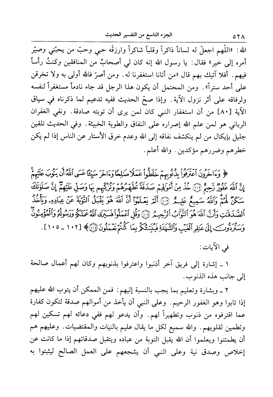 وَآخَرُونَ اعْتَرَفُوا بِذُنُوبِهِمْ خَلَطُوا عَمَلاً صالِحاً وَآخَرَ سَيِّئاً عَسَى اللَّهُ أَنْ يَتُوبَ عَلَيْهِمْ إِنَّ اللَّهَ غَفُورٌ رَحِيمٌ (102) خُذْ مِنْ أَمْوالِهِمْ صَدَقَةً تُطَهِّرُهُمْ وَتُزَكِّيهِمْ بِها وَصَلِّ عَلَيْهِمْ إِنَّ صَلاتَكَ سَكَنٌ لَهُمْ وَاللَّهُ سَمِيعٌ عَلِيمٌ (103) أَلَمْ يَعْلَمُوا أَنَّ اللَّهَ هُوَ يَقْبَلُ التَّوْبَةَ عَنْ عِبادِهِ وَيَأْخُذُ الصَّدَقاتِ وَأَنَّ اللَّهَ هُوَ التَّوَّابُ الرَّحِيمُ (104) وَقُلِ اعْمَلُوا فَسَيَرَى اللَّهُ عَمَلَكُمْ وَرَسُولُهُ وَالْمُؤْمِنُونَ وَسَتُرَدُّونَ إِلى عالِمِ الْغَيْبِ وَالشَّهادَةِ فَيُنَبِّئُكُمْ بِما كُنْتُمْ تَعْمَلُونَ (105)