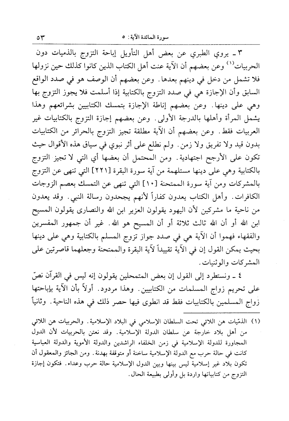 (1) الذمّيات هن اللائي تحت السلطان الإسلامي في البلاد الإسلامية. والحربيات هن اللائي من أهل بلاد خارجة عن سلطان الدولة الإسلامية. وقد نعتن بالحربيات لأن الدول المجاورة للدولة الإسلامية في زمن الخلفاء الراشدين والدولة الأموية والدولة العباسية كانت في حالة حرب مع الدولة الإسلامية ساخنة أو متوقفة بهدنة. ومن الجائز والمعقول أن تكون بلاد غير إسلامية ليس بينها وبين الدول الإسلامية حالة حرب وعداء. فتكون إجازة التزوج من كتابياتها واردة بل وأولى بطبيعة الحال.
