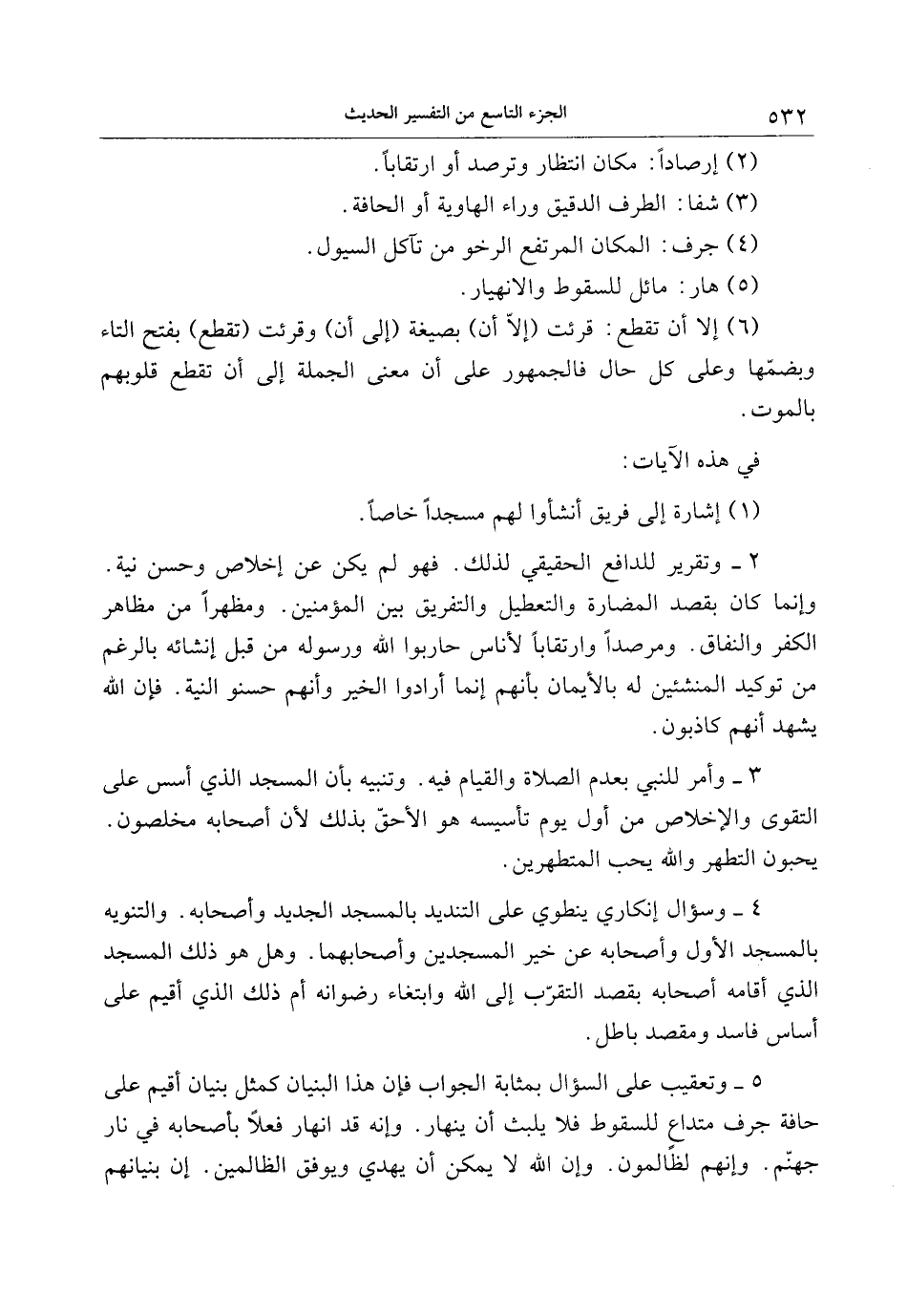 وإنما كان بقصد المضارة والتعطيل والتفريق بين المؤمنين. ومظهرا من مظاهر الكفر والنفاق. ومرصدا وارتقابا لأناس حاربوا الله ورسوله من قبل إنشائه بالرغم من توكيد المنشئين له بالأيمان بأنهم إنما أرادوا الخير وأنهم حسنو النية. فإن الله يشهد أنهم كاذبون.