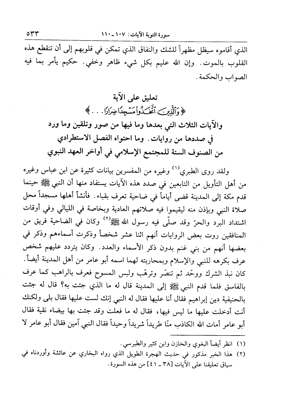 تعليق على الآية وَالَّذِينَ اتَّخَذُوا مَسْجِداً ضِراراً ... والآيات الثلاث التي بعدها وما فيها من صور وتلقين وما ورد في صددها من روايات. وما احتواه الفصل الاستطرادي من الصنوف الستة للمجتمع الإسلامي في أواخر العهد النبوي