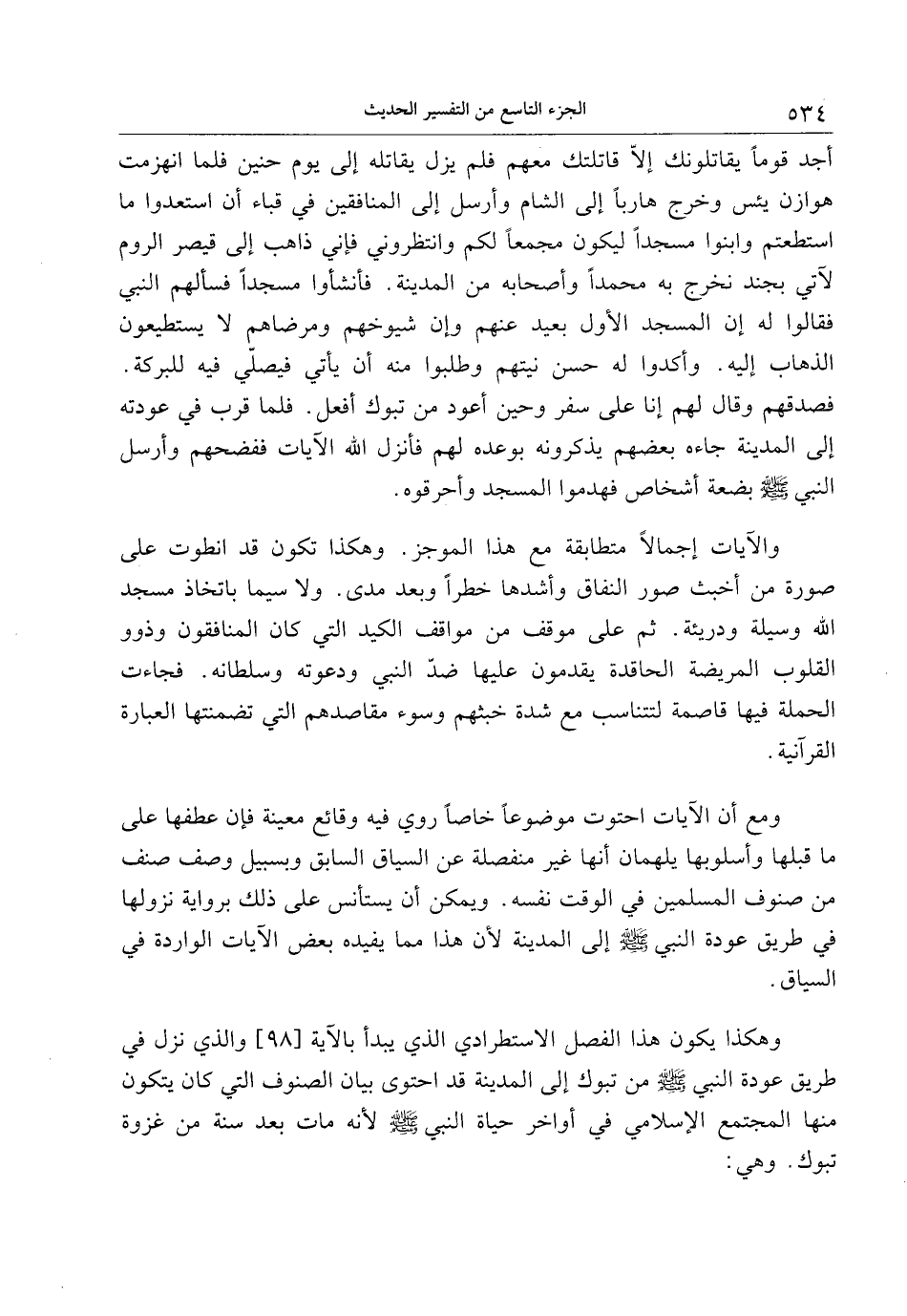وهكذا يكون هذا الفصل الاستطرادي الذي يبدأ بالآية [98] والذي نزل في طريق عودة النبي صلّى الله عليه وسلم من تبوك إلى المدينة قد احتوى بيان الصنوف التي كان يتكون منها المجتمع الإسلامي في أواخر حياة النبي صلّى الله عليه وسلم لأنه مات بعد سنة من غزوة تبوك. وهي:
