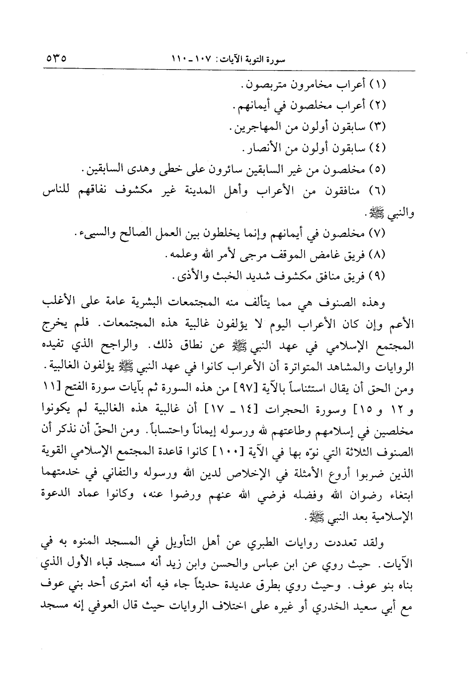 ومن الحق أن يقال استئناسا بالآية [97] من هذه السورة ثم بآيات سورة الفتح [11 و 12 و 15] وسورة الحجرات [14- 17] أن غالبية هذه الغالبية لم يكونوا مخلصين في إسلامهم وطاعتهم لله ورسوله إيمانا واحتسابا. ومن الحقّ أن نذكر أن الصنوف الثلاثة التي نوّه بها في الآية [100] كانوا قاعدة المجتمع الإسلامي القوية الذين ضربوا أروع الأمثلة في الإخلاص لدين الله ورسوله والتفاني في خدمتهما ابتغاء رضوان الله وفضله فرضي الله عنهم ورضوا عنه، وكانوا عماد الدعوة الإسلامية بعد النبي صلّى الله عليه وسلم.