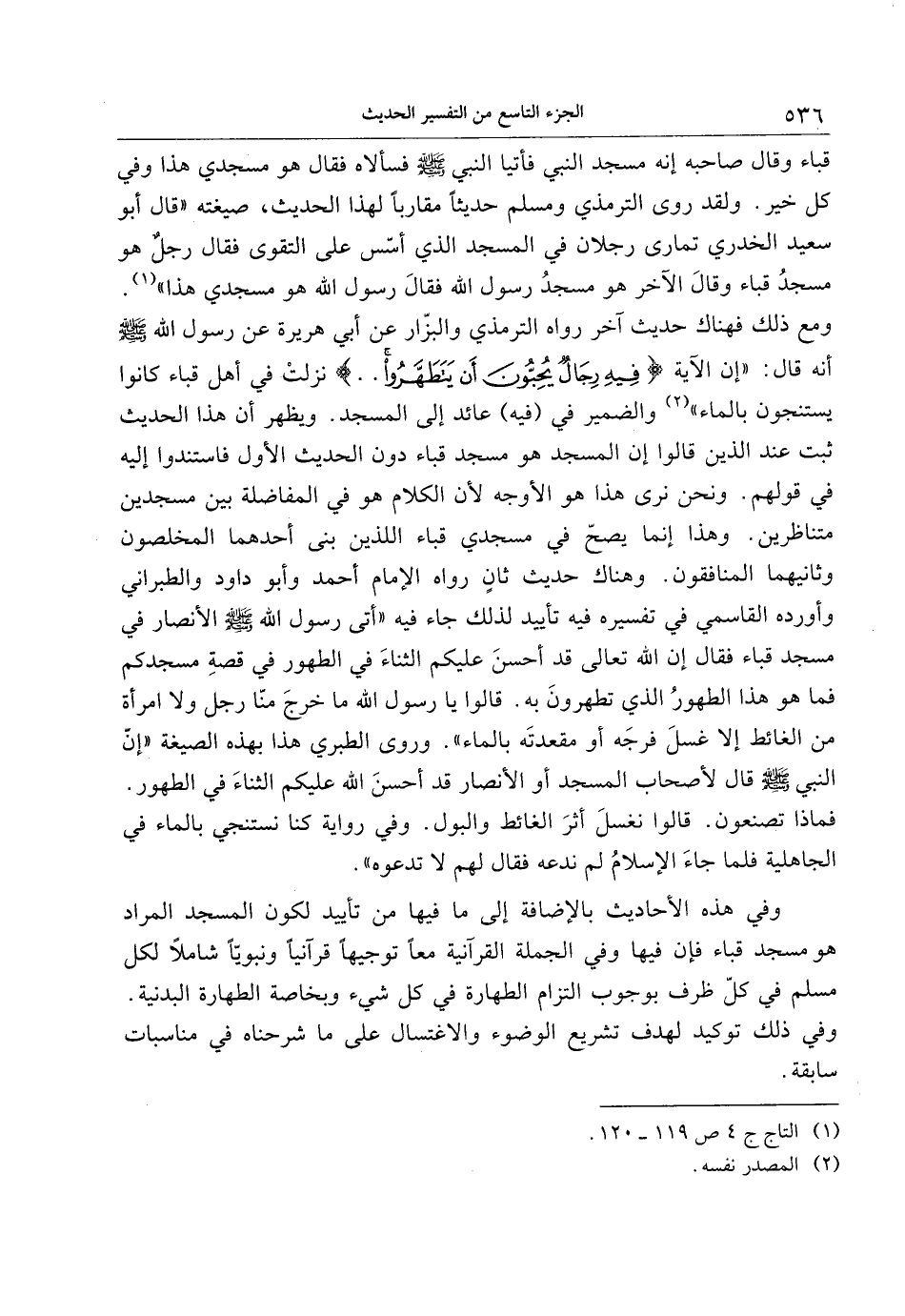 وفي هذه الأحاديث بالإضافة إلى ما فيها من تأييد لكون المسجد المراد هو مسجد قباء فإن فيها وفي الجملة القرآنية معا توجيها قرآنيا ونبويّا شاملا لكل مسلم في كلّ ظرف بوجوب التزام الطهارة في كل شيء وبخاصة الطهارة البدنية.