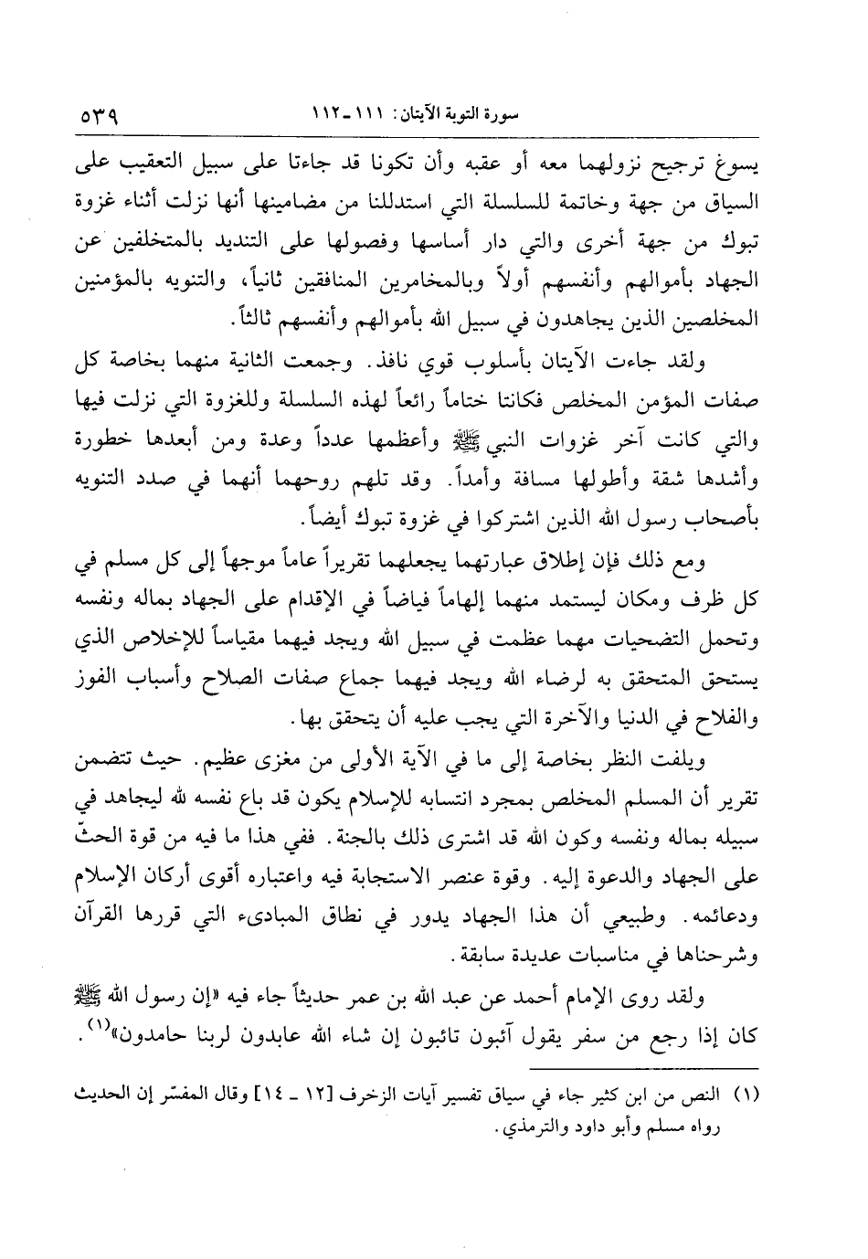 ويلفت النظر بخاصة إلى ما في الآية الأولى من مغزى عظيم. حيث تتضمن تقرير أن المسلم المخلص بمجرد انتسابه للإسلام يكون قد باع نفسه لله ليجاهد في سبيله بماله ونفسه وكون الله قد اشترى ذلك بالجنة. ففي هذا ما فيه من قوة الحثّ على الجهاد والدعوة إليه. وقوة عنصر الاستجابة فيه واعتباره أقوى أركان الإسلام ودعائمه. وطبيعي أن هذا الجهاد يدور في نطاق المبادئ التي قررها القرآن وشرحناها في مناسبات عديدة سابقة.