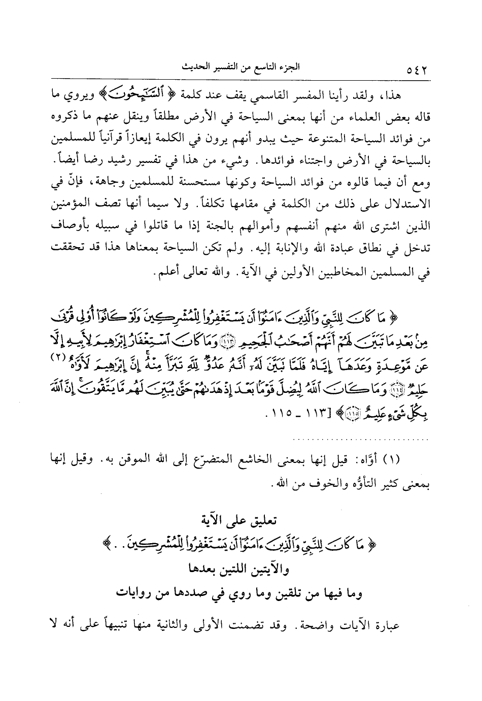 هذا، ولقد رأينا المفسر القاسمي يقف عند كلمة السَّائِحُونَ ويروي ما قاله بعض العلماء من أنها بمعنى السياحة في الأرض مطلقا وينقل عنهم ما ذكروه من فوائد السياحة المتنوعة حيث يبدو أنهم يرون في الكلمة إيعازا قرآنيا للمسلمين بالسياحة في الأرض واجتناء فوائدها. وشيء من هذا في تفسير رشيد رضا أيضا.