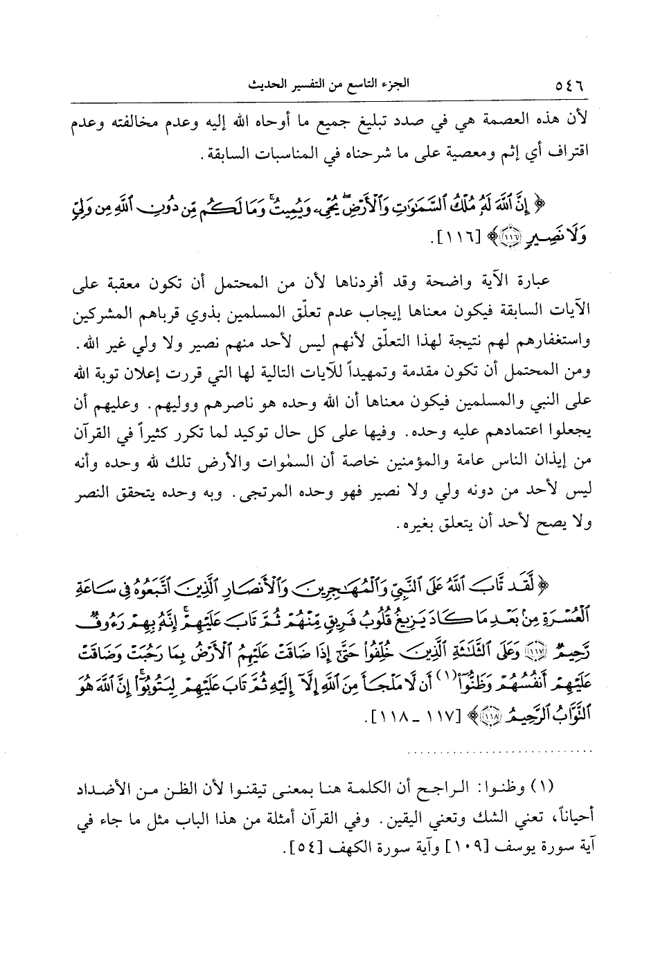 ومن المحتمل أن تكون مقدمة وتمهيدا للآيات التالية لها التي قررت إعلان توبة الله على النبي والمسلمين فيكون معناها أن الله وحده هو ناصرهم ووليهم. وعليهم أن يجعلوا اعتمادهم عليه وحده. وفيها على كل حال توكيد لما تكرر كثيرا في القرآن من إيذان الناس عامة والمؤمنين خاصة أن السموات والأرض تلك لله وحده وأنه ليس لأحد من دونه ولي ولا نصير فهو وحده المرتجى. وبه وحده يتحقق النصر ولا يصح لأحد أن يتعلق بغيره.
