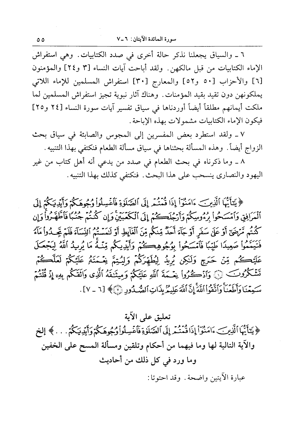 . تعليق على الآية يا أَيُّهَا الَّذِينَ آمَنُوا إِذا قُمْتُمْ إِلَى الصَّلاةِ فَاغْسِلُوا وُجُوهَكُمْ وَأَيْدِيَكُمْ ... إلخ والآية التالية لها وما فيهما من أحكام وتلقين ومسألة المسح على الخفين وما ورد في كل ذلك من أحاديث