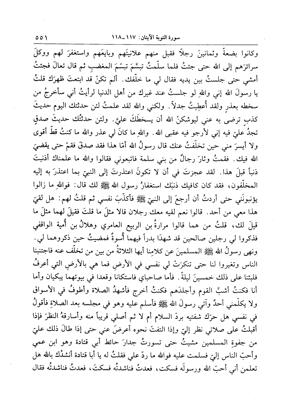 ونهى رسول الله صلى الله عليه وسلم المسلمين عن كلامنا أيها الثلاثة من بين من تخلّف عنه فاجتنبنا الناس وتغيروا لنا حتى تنكرت لي نفسي في الأرض فما هي بالأرض التي أعرف فلبثنا على ذلك خمسين ليلة. فأما صاحباي فاستكانا وقعدا في بيوتهما يبكيان وأما أنا فكنت أشبّ القوم وأجلدهم فكنت أخرج فأشهد الصلاة وأطوف في الأسواق ولا يكلّمني أحد وآتي رسول الله صلى الله عليه وسلم فأسلم عليه وهو في مجلسه بعد الصلاة فأقول في نفسي هل حرّك شفتيه بردّ السلام أم لا ثم أصلي قريبا منه وأسارقه النظر فإذا أقبلت على صلاتي نظر إليّ وإذا التفتّ نحوه أعرض عني حتى إذا طال ذلك عليّ من جفوة المسلمين مشيت حتى تسورت جدار حائط أبي قتادة وهو ابن عمي وأحبّ الناس إليّ فسلمت عليه فو الله ما ردّ علي فقلت له يا أبا قتادة أنشدك بالله هل تعلمن أني أحبّ الله ورسوله فسكت، فعدت فناشدته فسكت، فعدت فناشدته فقال