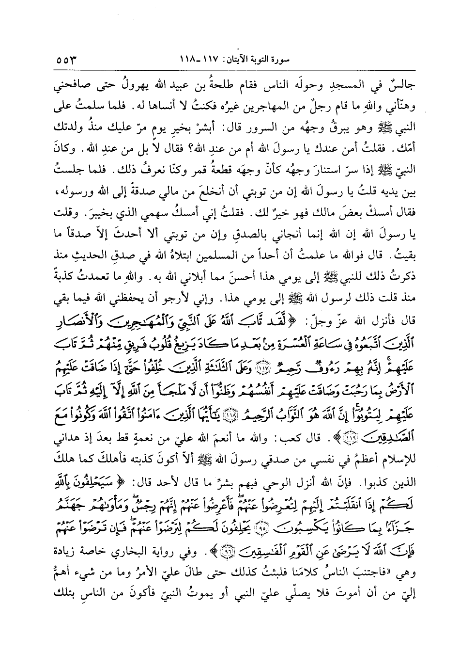 صدقا ما بقيت. قال فو الله ما علمت أن أحدا من المسلمين ابتلاه الله في صدق الحديث منذ ذكرت ذلك للنبي صلى الله عليه وسلم إلى يومي هذا أحسن مما أبلاني الله به. والله ما تعمدت كذبة منذ قلت ذلك لرسول الله صلى الله عليه وسلم إلى يومي هذا. وإني لأرجو أن يحفظني الله فيما بقي قال فأنزل الله عزّ وجلّ: لَقَدْ تابَ اللَّهُ عَلَى النَّبِيِّ وَالْمُهاجِرِينَ وَالْأَنْصارِ الَّذِينَ اتَّبَعُوهُ فِي ساعَةِ الْعُسْرَةِ مِنْ بَعْدِ ما كادَ يَزِيغُ قُلُوبُ فَرِيقٍ مِنْهُمْ ثُمَّ تابَ عَلَيْهِمْ إِنَّهُ بِهِمْ رَؤُفٌ رَحِيمٌ (117) وَعَلَى الثَّلاثَةِ الَّذِينَ خُلِّفُوا حَتَّى إِذا ضاقَتْ عَلَيْهِمُ الْأَرْضُ بِما رَحُبَتْ وَضاقَتْ عَلَيْهِمْ أَنْفُسُهُمْ وَظَنُّوا أَنْ لا مَلْجَأَ مِنَ اللَّهِ إِلَّا إِلَيْهِ ثُمَّ تابَ عَلَيْهِمْ لِيَتُوبُوا إِنَّ اللَّهَ هُوَ التَّوَّابُ الرَّحِيمُ (118) يا أَيُّهَا الَّذِينَ آمَنُوا اتَّقُوا اللَّهَ وَكُونُوا مَعَ الصَّادِقِينَ (119) . قال كعب: والله ما أنعم الله عليّ من نعمة قط بعد إذ هداني للإسلام أعظم في نفسي من صدقي رسول الله صلى الله عليه وسلم ألّا أكون كذبته فأهلك كما هلك الذين كذبوا. فإنّ الله أنزل الوحي فيهم بشرّ ما قال لأحد قال: سَيَحْلِفُونَ بِاللَّهِ لَكُمْ إِذَا انْقَلَبْتُمْ إِلَيْهِمْ لِتُعْرِضُوا عَنْهُمْ فَأَعْرِضُوا عَنْهُمْ إِنَّهُمْ رِجْسٌ وَمَأْواهُمْ جَهَنَّمُ جَزاءً بِما كانُوا يَكْسِبُونَ (95) يَحْلِفُونَ لَكُمْ لِتَرْضَوْا عَنْهُمْ فَإِنْ تَرْضَوْا عَنْهُمْ فَإِنَّ اللَّهَ لا يَرْضى عَنِ الْقَوْمِ الْفاسِقِينَ (96) . وفي رواية البخاري خاصة زيادة وهي «فاجتنب الناس كلامنا فلبثت كذلك حتى طال عليّ الأمر وما من شيء أهمّ إليّ من أن أموت فلا يصلّي عليّ النبي أو يموت النبيّ فأكون من الناس بتلك