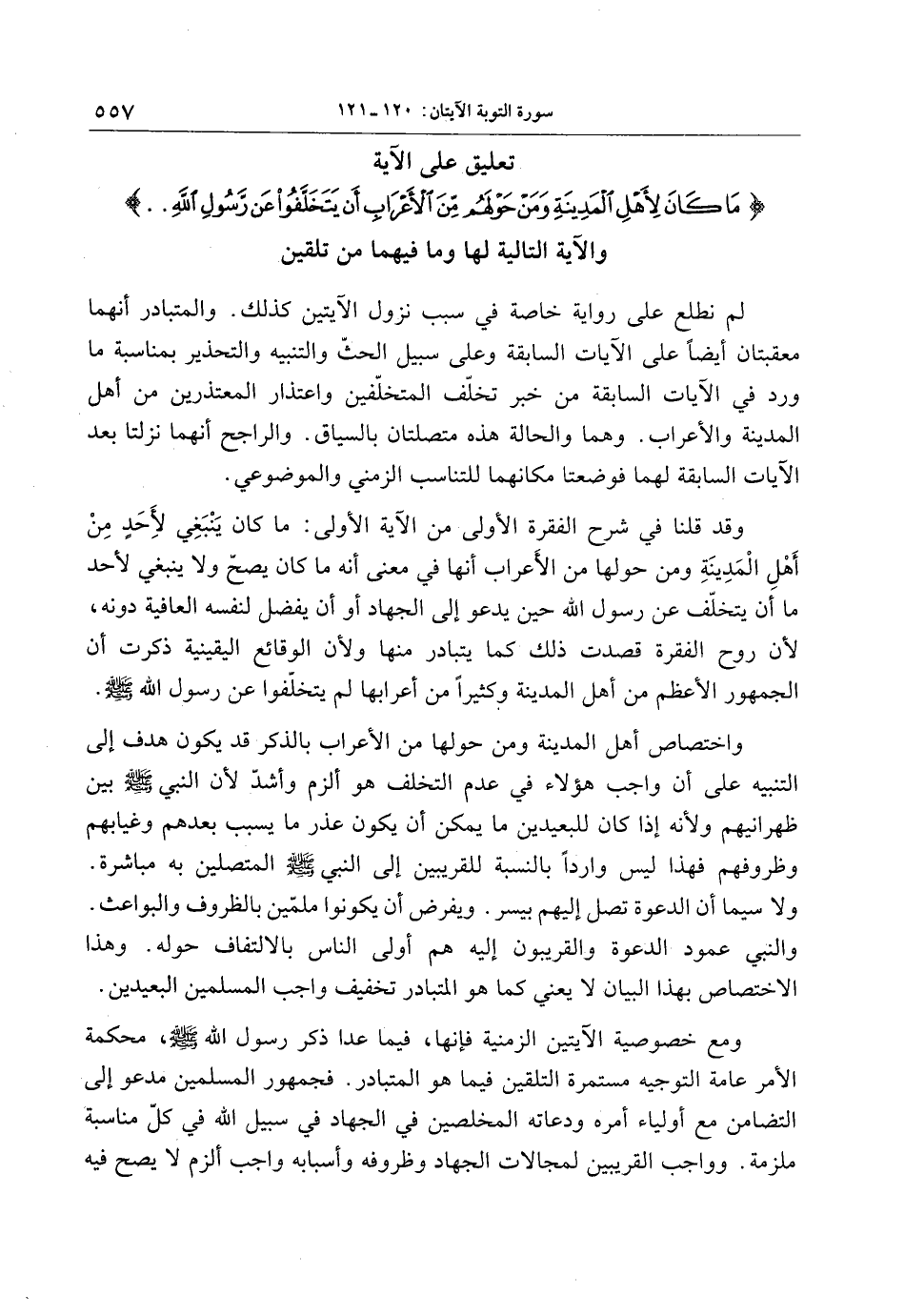 تعليق على الآية ما كانَ لِأَهْلِ الْمَدِينَةِ وَمَنْ حَوْلَهُمْ مِنَ الْأَعْرابِ أَنْ يَتَخَلَّفُوا عَنْ رَسُولِ اللَّهِ.. والآية التالية لها وما فيهما من تلقين