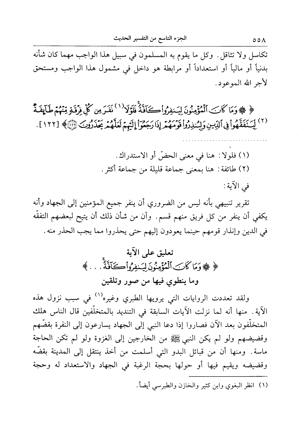 تقرير تنبيهي بأنه ليس من الضروري أن ينفر جميع المؤمنين إلى الجهاد وأنه يكفي أن ينفر من كل فريق منهم قسم. وأن من شأن ذلك أن يتيح لبعضهم التفقّه في الدين وإنذار قومهم حينما يعودون إليهم حتى يحذروا مما يجب الحذر منه.