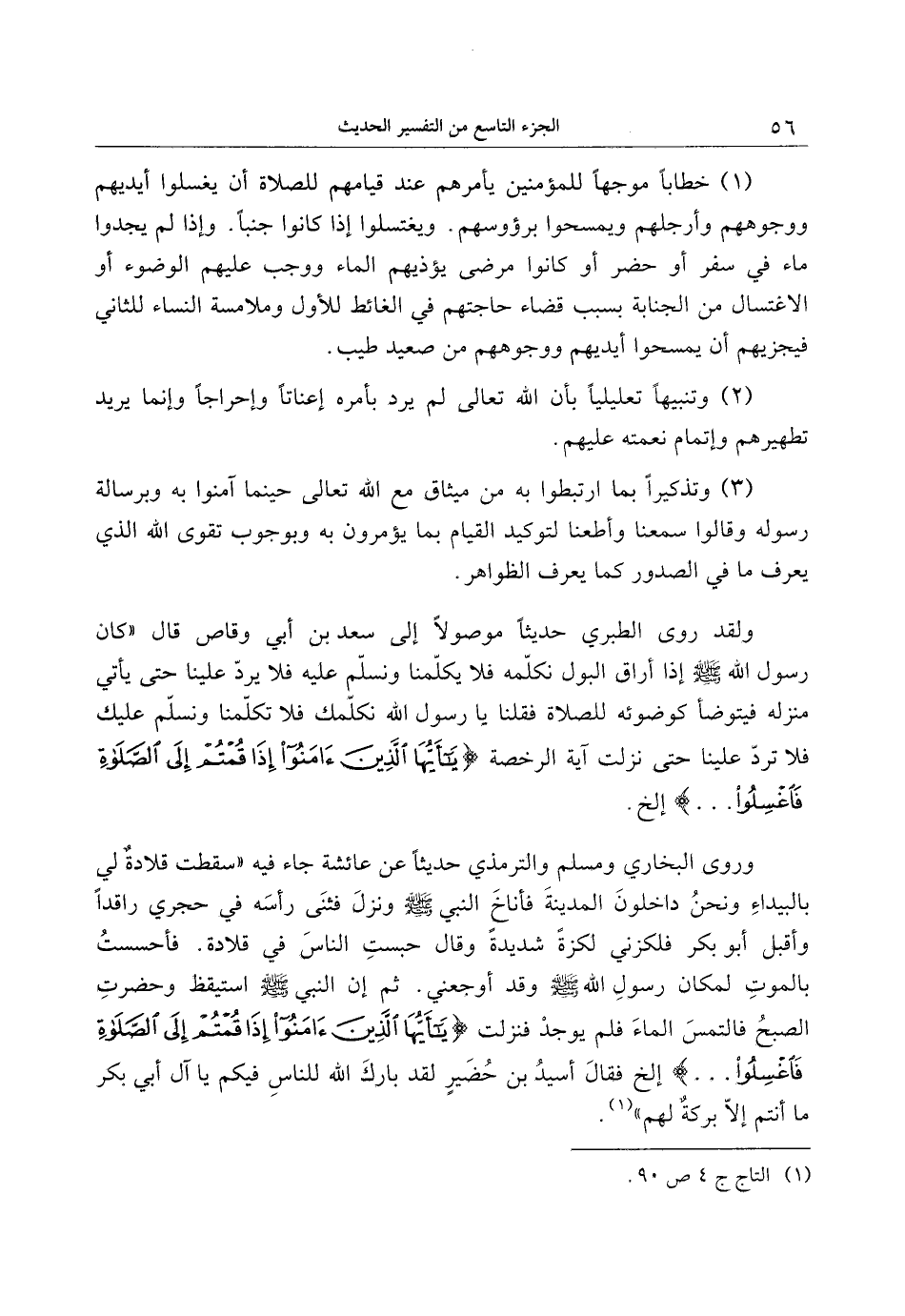 ولقد روى الطبري حديثا موصولا إلى سعد بن أبي وقاص قال «كان رسول الله صلى الله عليه وسلم إذا أراق البول نكلّمه فلا يكلّمنا ونسلّم عليه فلا يردّ علينا حتى يأتي منزله فيتوضأ كوضوئه للصلاة فقلنا يا رسول الله نكلّمك فلا تكلّمنا ونسلّم عليك فلا تردّ علينا حتى نزلت آية الرخصة يا أَيُّهَا الَّذِينَ آمَنُوا إِذا قُمْتُمْ إِلَى الصَّلاةِ فَاغْسِلُوا ... إلخ.