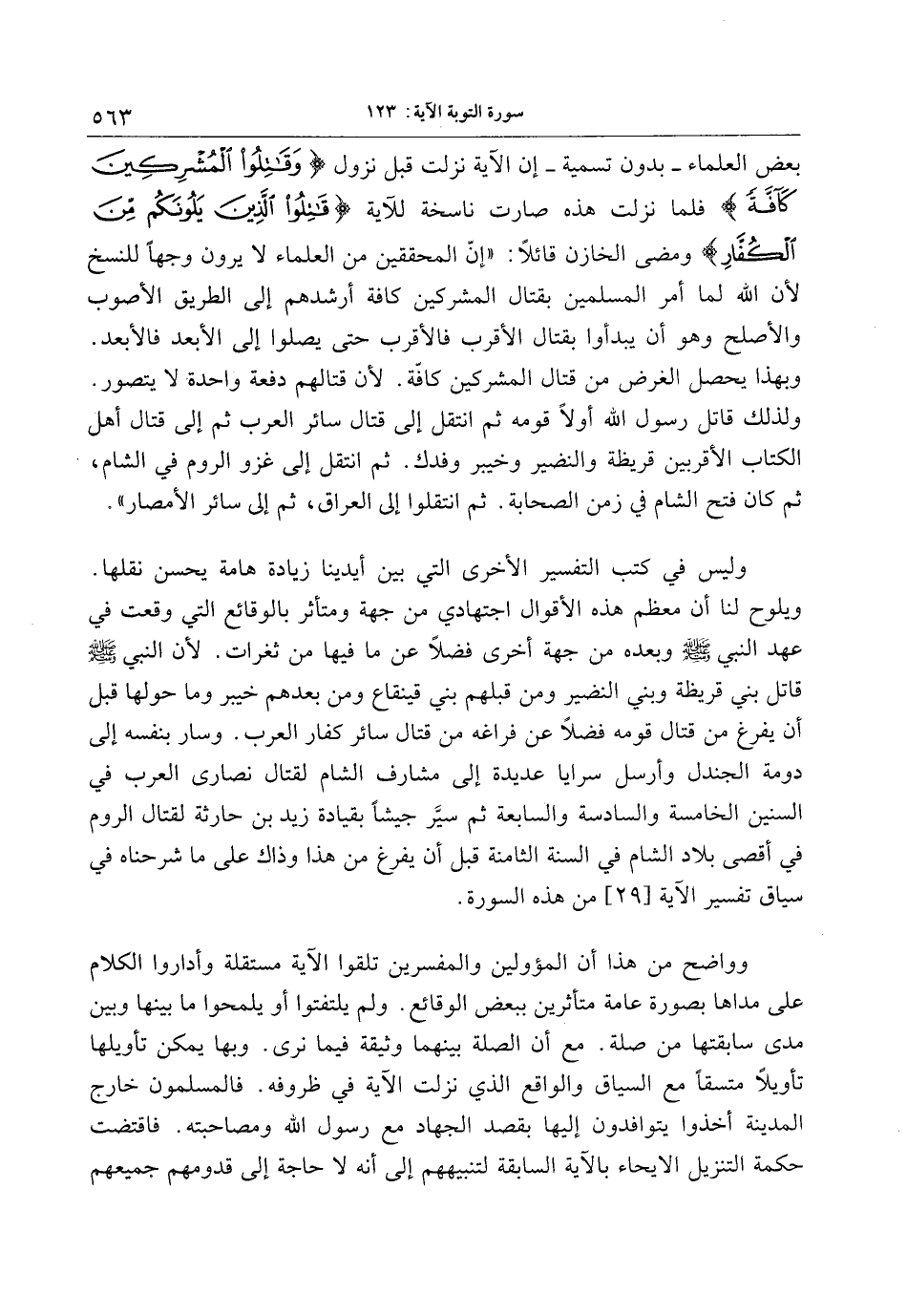 ويلوح لنا أن معظم هذه الأقوال اجتهادي من جهة ومتأثر بالوقائع التي وقعت في عهد النبي صلى الله عليه وسلم وبعده من جهة أخرى فضلا عن ما فيها من ثغرات. لأن النبي صلى الله عليه وسلم قاتل بني قريظة وبني النضير ومن قبلهم بني قينقاع ومن بعدهم خيبر وما حولها قبل أن يفرغ من قتال قومه فضلا عن فراغه من قتال سائر كفار العرب. وسار بنفسه إلى دومة الجندل وأرسل سرايا عديدة إلى مشارف الشام لقتال نصارى العرب في السنين الخامسة والسادسة والسابعة ثم سيّر جيشا بقيادة زيد بن حارثة لقتال الروم في أقصى بلاد الشام في السنة الثامنة قبل أن يفرغ من هذا وذاك على ما شرحناه في سياق تفسير الآية [29] من هذه السورة.