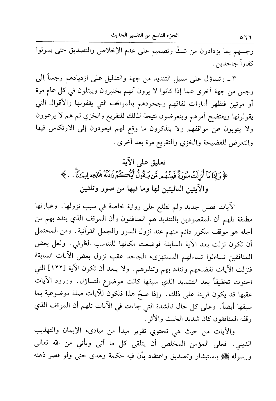 تعليق على الآية وَإِذا ما أُنْزِلَتْ سُورَةٌ فَمِنْهُمْ مَنْ يَقُولُ أَيُّكُمْ زادَتْهُ هذِهِ إِيماناً.. والآيتين التاليتين لها وما فيها من صور وتلقين