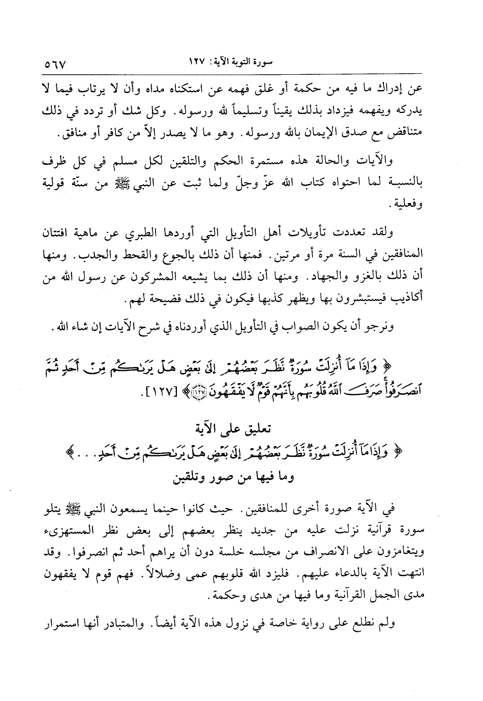 وَإِذا ما أُنْزِلَتْ سُورَةٌ نَظَرَ بَعْضُهُمْ إِلى بَعْضٍ هَلْ يَراكُمْ مِنْ أَحَدٍ ثُمَّ انْصَرَفُوا صَرَفَ اللَّهُ قُلُوبَهُمْ بِأَنَّهُمْ قَوْمٌ لا يَفْقَهُونَ (127)