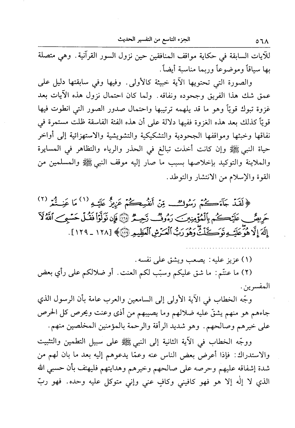 لَقَدْ جاءَكُمْ رَسُولٌ مِنْ أَنْفُسِكُمْ عَزِيزٌ عَلَيْهِ ما عَنِتُّمْ حَرِيصٌ عَلَيْكُمْ بِالْمُؤْمِنِينَ رَؤُفٌ رَحِيمٌ (128) فَإِنْ تَوَلَّوْا فَقُلْ حَسْبِيَ اللَّهُ لا إِلهَ إِلاَّ هُوَ عَلَيْهِ تَوَكَّلْتُ وَهُوَ رَبُّ الْعَرْشِ الْعَظِيمِ (129)