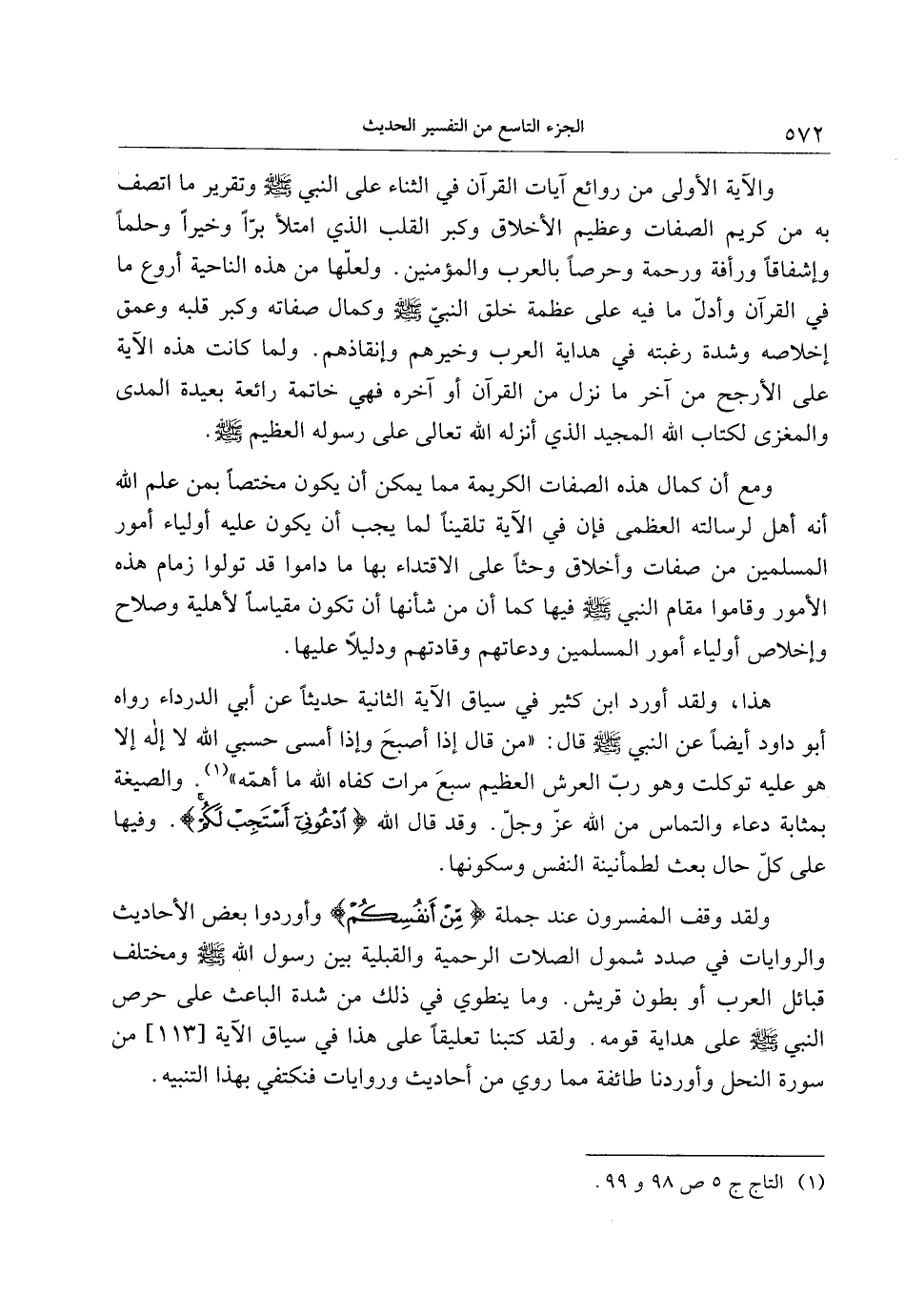 هذا، ولقد أورد ابن كثير في سياق الآية الثانية حديثا عن أبي الدرداء رواه أبو داود أيضا عن النبي صلى الله عليه وسلم قال: «من قال إذا أصبح وإذا أمسى حسبي الله لا إله إلا هو عليه توكلت وهو ربّ العرش العظيم سبع مرات كفاه الله ما أهمّه» «1» . والصيغة بمثابة دعاء والتماس من الله عزّ وجلّ. وقد قال الله ادْعُونِي أَسْتَجِبْ لَكُمْ. وفيها على كلّ حال بعث لطمأنينة النفس وسكونها.