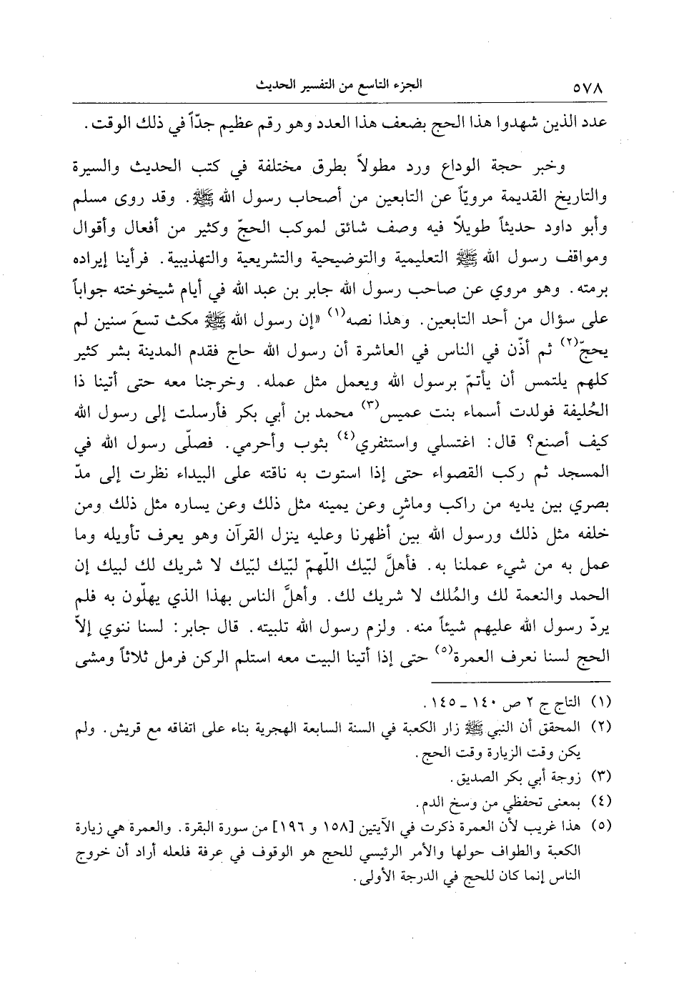 (5) هذا غريب لأن العمرة ذكرت في الآيتين [158 و 196] من سورة البقرة. والعمرة هي زيارة الكعبة والطواف حولها والأمر الرئيسي للحج هو الوقوف في عرفة فلعله أراد أن خروج الناس إنما كان للحج في الدرجة الأولى.