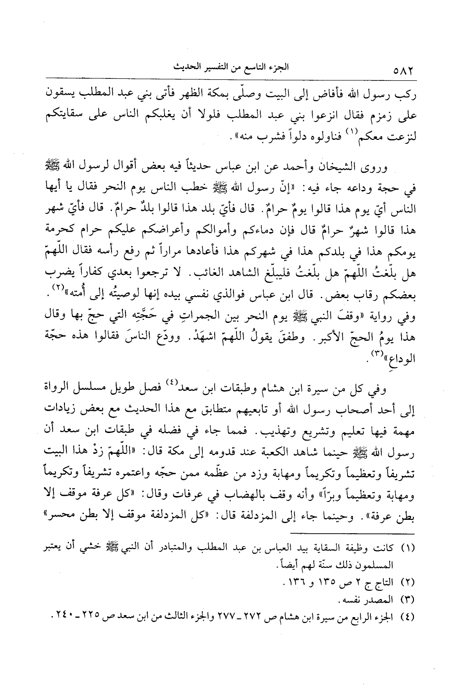 وفي كل من سيرة ابن هشام وطبقات ابن سعد «4» فصل طويل مسلسل الرواة إلى أحد أصحاب رسول الله أو تابعيهم متطابق مع هذا الحديث مع بعض زيادات مهمة فيها تعليم وتشريع وتهذيب. فمما جاء في فضله في طبقات ابن سعد أن رسول الله صلى الله عليه وسلم حينما شاهد الكعبة عند قدومه إلى مكة قال: «اللهمّ زد هذا البيت تشريفا وتعظيما وتكريما ومهابة وزد من عظّمه ممن حجّه واعتمره تشريفا وتكريما ومهابة وتعظيما وبرّا» وأنه وقف بالهضاب في عرفات وقال: «كل عرفة موقف إلا بطن عرفة» . وحينما جاء إلى المزدلفة قال: «كل المزدلفة موقف إلا بطن محسر»