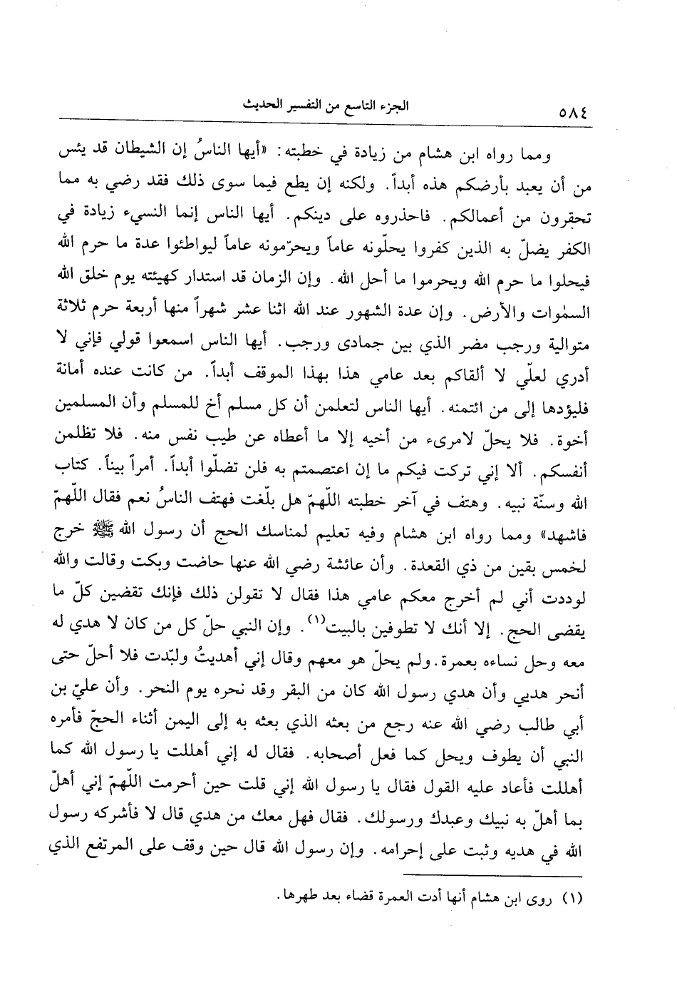 ومما رواه ابن هشام من زيادة في خطبته: «أيها الناس إن الشيطان قد يئس من أن يعبد بأرضكم هذه أبدا. ولكنه إن يطع فيما سوى ذلك فقد رضي به مما تحقرون من أعمالكم. فاحذروه على دينكم. أيها الناس إنما النسيء زيادة في الكفر يضلّ به الذين كفروا يحلّونه عاما ويحرّمونه عاما ليواطئوا عدة ما حرم الله فيحلوا ما حرم الله ويحرموا ما أحل الله. وإن الزمان قد استدار كهيئته يوم خلق الله السموات والأرض. وإن عدة الشهور عند الله اثنا عشر شهرا منها أربعة حرم ثلاثة متوالية ورجب مضر الذي بين جمادى ورجب. أيها الناس اسمعوا قولي فإني لا أدري لعلّي لا ألقاكم بعد عامي هذا بهذا الموقف أبدا. من كانت عنده أمانة فليؤدها إلى من ائتمنه. أيها الناس لتعلمن أن كل مسلم أخ للمسلم وأن المسلمين أخوة. فلا يحلّ لامرىء من أخيه إلا ما أعطاه عن طيب نفس منه. فلا تظلمن أنفسكم. ألا إني تركت فيكم ما إن اعتصمتم به فلن تضلّوا أبدا. أمرا بينا. كتاب الله وسنّة نبيه. وهتف في آخر خطبته اللهمّ هل بلّغت فهتف الناس نعم فقال اللهمّ فاشهد» ومما رواه ابن هشام وفيه تعليم لمناسك الحج أن رسول الله صلى الله عليه وسلم خرج لخمس بقين من ذي القعدة. وأن عائشة رضي الله عنها حاضت وبكت وقالت والله لوددت أني لم أخرج معكم عامي هذا فقال لا تقولن ذلك فإنك تقضين كلّ ما يقضى الحج. إلا أنك لا تطوفين بالبيت «1» . وإن النبي حلّ كل من كان لا هدي له معه وحل نساءه بعمرة. ولم يحلّ هو معهم وقال إني أهديت ولبّدت فلا أحلّ حتى أنحر هديي وأن هدي رسول الله كان من البقر وقد نحره يوم النحر. وأن عليّ بن أبي طالب رضي الله عنه رجع من بعثه الذي بعثه به إلى اليمن أثناء الحجّ فأمره النبي أن يطوف ويحل كما فعل أصحابه. فقال له إني أهللت يا رسول الله كما أهللت فأعاد عليه القول فقال يا رسول الله إني قلت حين أحرمت اللهمّ إني أهلّ بما أهلّ به نبيك وعبدك ورسولك. فقال فهل معك من هدي قال لا فأشركه رسول الله في هديه وثبت على إحرامه. وإن رسول الله قال حين وقف على المرتفع الذي