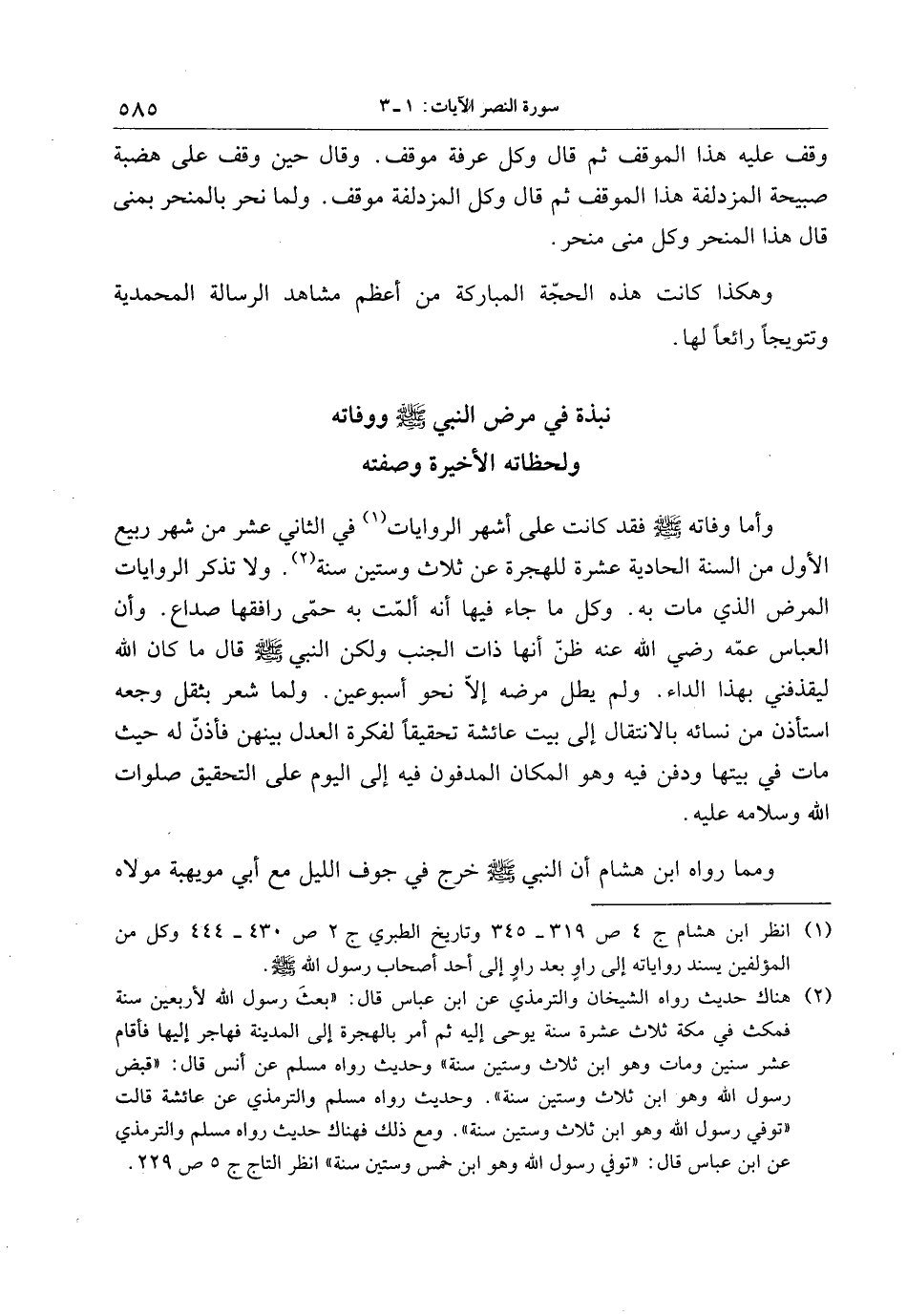 (2) هناك حديث رواه الشيخان والترمذي عن ابن عباس قال: «بعث رسول الله لأربعين سنة فمكث في مكة ثلاث عشرة سنة يوحى إليه ثم أمر بالهجرة إلى المدينة فهاجر إليها فأقام عشر سنين ومات وهو ابن ثلاث وستين سنة» . وحديث رواه مسلم عن أنس قال: «قبض رسول الله وهو ابن ثلاث وستين سنة» . وحديث رواه مسلم والترمذي عن عائشة قالت «توفي رسول الله وهو ابن ثلاث وستين سنة» . ومع ذلك فهناك حديث رواه مسلم والترمذي عن ابن عباس قال: «توفي رسول الله وهو ابن خمس وستين سنة» انظر التاج ج 5 ص 229.