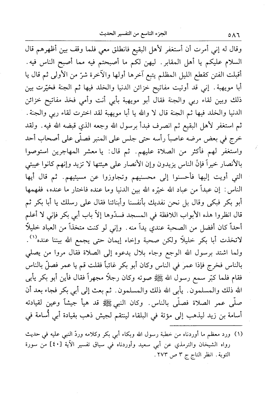 (1) ورد معظم ما أوردناه من خطبة رسول الله وبكاء أبي بكر وكلامه وردّ النبي عليه في حديث رواه الشيخان والترمذي عن أبي سعيد وأوردناه في سياق تفسير الآية [40] من سورة التوبة. انظر التاج ج 3 ص 273.