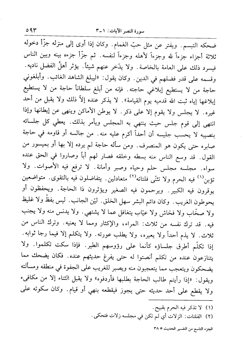 وقسمه على قدر فضلهم في الدين. وكان يقول: «ليبلغ الشاهد الغائب. وأبلغوني حاجة من لا يستطيع إبلاغي حاجته. فإنه من أبلغ سلطانا حاجة من لا يستطيع إبلاغها إياه ثبت الله قدميه يوم القيامة» . لا يذكر عنده إلّا ذلك ولا يقبل من أحد غيره. لا يجلس ولا يقوم إلا على ذكر. لا يوطن الأماكن وينهى عن إيطانها وإذا انتهى إلى قوم جلس حيث ينتهي به المجلس ويأمر بذلك. يعطي كل جلسائه بنصيبه لا يحسب جليسه أن أحدا أكرم عليه منه. من جالسه أو قاومه في حاجة صابره حتى يكون هو المنصرف. ومن سأله حاجة لم يرده إلا بها أو بميسور من القول. قد وسع الناس منه بسطه وخلقه فصار لهم أبا وصاروا في الحق عنده سواء. مجلسه مجلس حلم وحياء وصبر وأمانة. لا ترفع فيه الأصوات. ولا تؤبن «1» فيه الحرم ولا تثنّى فلتاته «2» متعادلين. يتفاضلون فيه بالتقوى. متواضعين يوقرون فيه الكبير. ويرحمون فيه الصغير ويؤثرون ذا الحاجة. ويحفظون أو يحوطون الغريب. وكان دائم البشر سهل الخلق. ليّن الجانب. ليس بفظّ ولا غليظ ولا صخّاب ولا فحّاش ولا عيّاب يتغافل عما لا يشتهي. ولا يدنس منه ولا يجنب فيه. قد ترك نفسه من ثلاث: المراء، والإكثار ومما لا يعنيه. وترك الناس من ثلاث. لا يذم أحدا ولا يعيره، ولا يطلب عورته. ولا يتكلم إلا فيما رجا ثوابه.