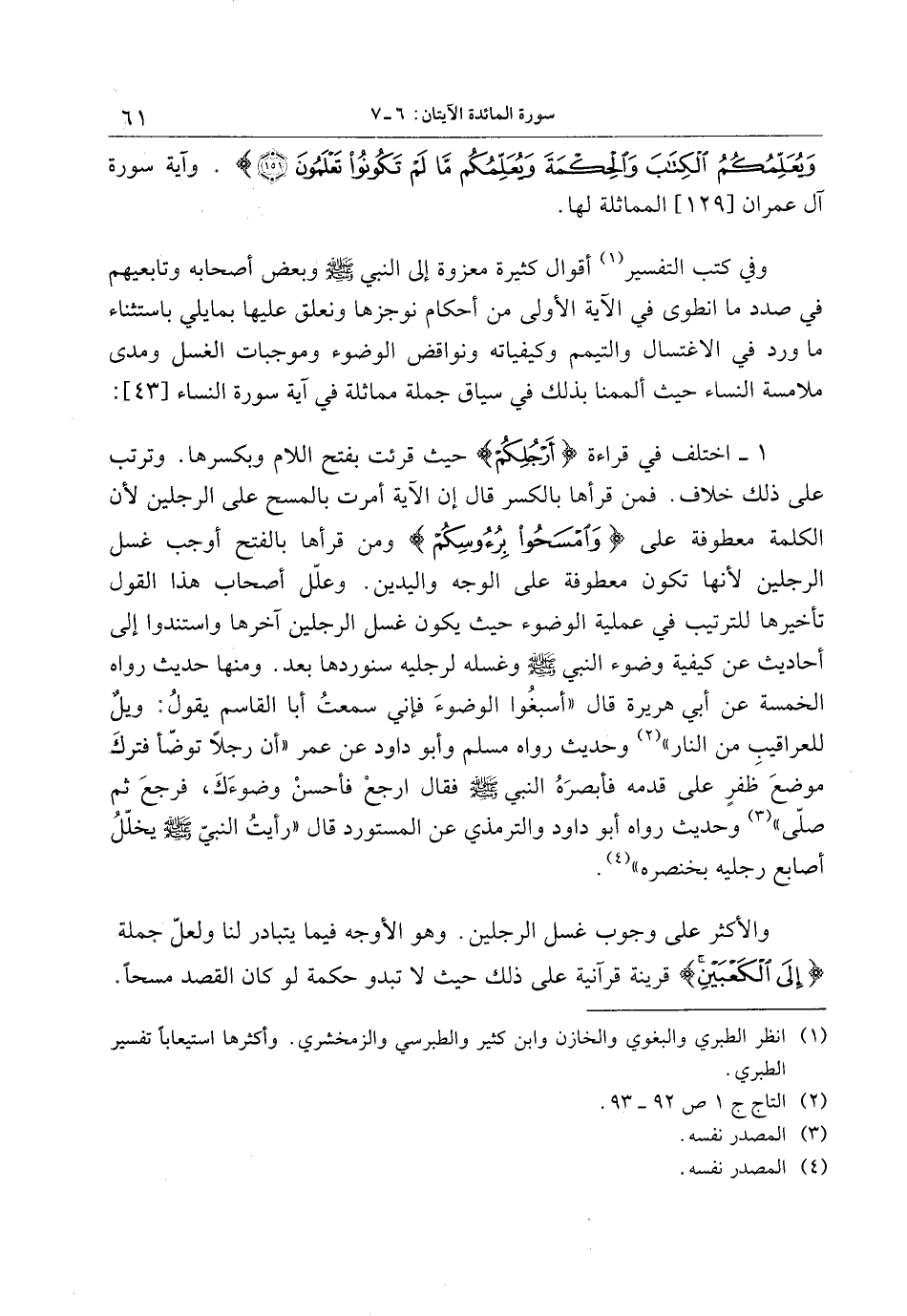 1- اختلف في قراءة أَرْجُلَكُمْ حيث قرئت بفتح اللام وبكسرها. وترتب على ذلك خلاف. فمن قرأها بالكسر قال إن الآية أمرت بالمسح على الرجلين لأن الكلمة معطوفة على وَامْسَحُوا بِرُؤُسِكُمْ ومن قرأها بالفتح أوجب غسل الرجلين لأنها تكون معطوفة على الوجه واليدين. وعلّل أصحاب هذا القول تأخيرها للترتيب في عملية الوضوء حيث يكون غسل الرجلين آخرها واستندوا إلى أحاديث عن كيفية وضوء النبي صلى الله عليه وسلم وغسله لرجليه سنوردها بعد. ومنها حديث رواه الخمسة عن أبي هريرة قال «أسبغوا الوضوء فإني سمعت أبا القاسم يقول: ويل للعراقيب من النار» «2» وحديث رواه مسلم وأبو داود عن عمر «أن رجلا توضّأ فترك موضع ظفر على قدمه فأبصره النبي صلى الله عليه وسلم فقال ارجع فأحسن وضوءك، فرجع ثم صلّى» «3» وحديث رواه أبو داود والترمذي عن المستورد قال «رأيت النبيّ صلى الله عليه وسلم يخلّل أصابع رجليه بخنصره» «4» .