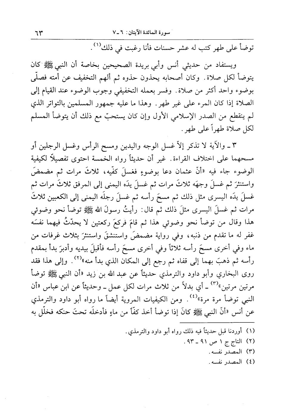 3- والآية لا تذكر إلّا غسل الوجه واليدين ومسح الرأس وغسل الرجلين أو مسحهما على اختلاف القراءة. غير أن حديثا رواه الخمسة احتوى تفصيلا لكيفية الوضوء جاء فيه «أنّ عثمان دعا بوضوء فغسل كفّيه، ثلاث مرات ثم مضمض واستنثر ثم غسل وجه هـ ثلاث مرات ثم غسل يده اليمنى إلى المرفق ثلاث مرات ثم غسل يده اليسرى مثل ذلك ثم مسح رأسه ثم غسل رجله اليمنى إلى الكعبين ثلاث مرات ثم غسل اليسرى مثل ذلك ثم قال: رأيت رسول الله صلى الله عليه وسلم توضأ نحو وضوئي هذا وقال من توضأ نحو وضوئي هذا ثم قام فركع ركعتين لا يحدّث فيهما نفسه غفر له ما تقدم من ذنبه، وفي رواية مضمض واستنشق واستنثر بثلاث غرفات من ماء وفي أخرى مسح رأسه ثلاثا وفي أخرى مسح رأسه فأقبل بيديه وأدبر بدأ بمقدم رأسه ثم ذهب بهما إلى قفاه ثم رجع إلى المكان الذي بدأ منه» «2» . وإلى هذا فقد روى البخاري وأبو داود والترمذي حديثا عن عبد الله بن زيد «أن النبي صلى الله عليه وسلم توضأ مرتين مرتين» «3» - أي بدلا من ثلاث مرات لكل عمل- وحديثا عن ابن عباس «أن النبي توضأ مرة مرة» «4» . ومن الكيفيات المروية أيضا ما رواه أبو داود والترمذي عن أنس «أنس النبي صلى الله عليه وسلم كان إذا توضأ أخذ كفّا من ماء فأدخله تحت حنكه فخلّل به