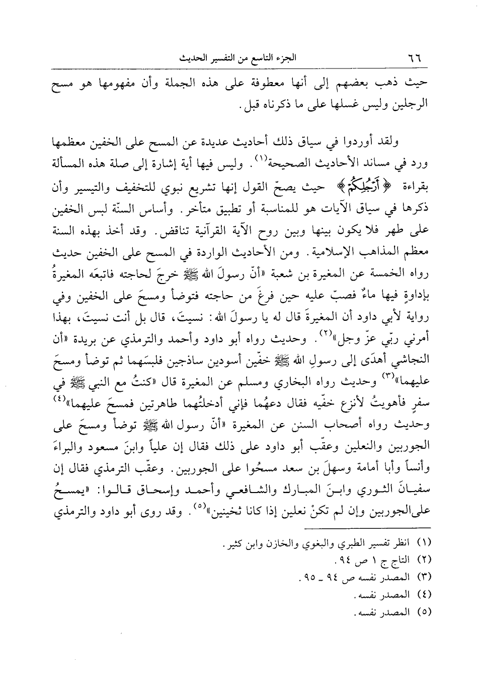 ولقد أوردوا في سياق ذلك أحاديث عديدة عن المسح على الخفين معظمها ورد في مساند الأحاديث الصحيحة «1» . وليس فيها أية إشارة إلى صلة هذه المسألة بقراءة أَرْجُلَكُمْ حيث يصحّ القول إنها تشريع نبوي للتخفيف والتيسير وأن ذكرها في سياق الآيات هو للمناسبة أو تطبيق متأخر. وأساس السنّة لبس الخفين على طهر فلا يكون بينها وبين روح الآية القرآنية تناقض. وقد أخذ بهذه السنة معظم المذاهب الإسلامية. ومن الأحاديث الواردة في المسح على الخفين حديث رواه الخمسة عن المغيرة بن شعبة «أنّ رسول الله صلى الله عليه وسلم خرج لحاجته فاتبعه المغيرة بإداوة فيها ماء فصبّ عليه حين فرغ من حاجته فتوضأ ومسح على الخفين وفي رواية لأبي داود أن المغيرة قال له يا رسول الله: نسيت، قال بل أنت نسيت، بهذا أمرني ربّي عزّ وجل» «2» . وحديث رواه أبو داود وأحمد والترمذي عن بريدة «أن النجاشي أهدى إلى رسول الله صلى الله عليه وسلم خفّين أسودين ساذجين فلبسهما ثم توضأ ومسح عليهما» «3» وحديث رواه البخاري ومسلم عن المغيرة قال «كنت مع النبي صلى الله عليه وسلم في سفر فأهويت لأنزع خفّيه فقال دعهما فإني أدخلتهما طاهرتين فمسح عليهما» «4» وحديث رواه أصحاب السنن عن المغيرة «أنّ رسول الله صلى الله عليه وسلم توضأ ومسح على الجوربين والنعلين وعقّب أبو داود على ذلك فقال إن عليا وابن مسعود والبراء وأنسا وأبا أمامة وسهل بن سعد مسحوا على الجوربين. وعقّب الترمذي فقال إن سفيان الثوري وابن المبارك والشافعي وأحمد وإسحاق قالوا: «يمسح على الجوربين وإن لم تكن نعلين إذا كانا ثخينين» «5» . وقد روى أبو داود والترمذي