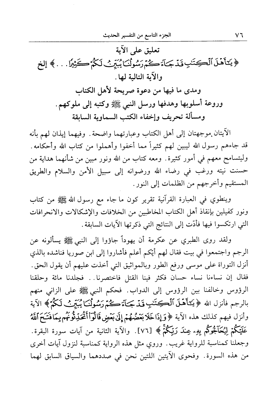 تعليق على الآية يا أَهْلَ الْكِتابِ قَدْ جاءَكُمْ رَسُولُنا يُبَيِّنُ لَكُمْ كَثِيراً ... إلخ والآية التالية لها. ومدى ما فيها من دعوة صريحة لأهل الكتاب وروعة أسلوبها وهدفها ورسل النبي صلى الله عليه وسلم وكتبه إلى ملوكهم. ومسألة تحريف وإخفاء الكتب السماوية السابقة